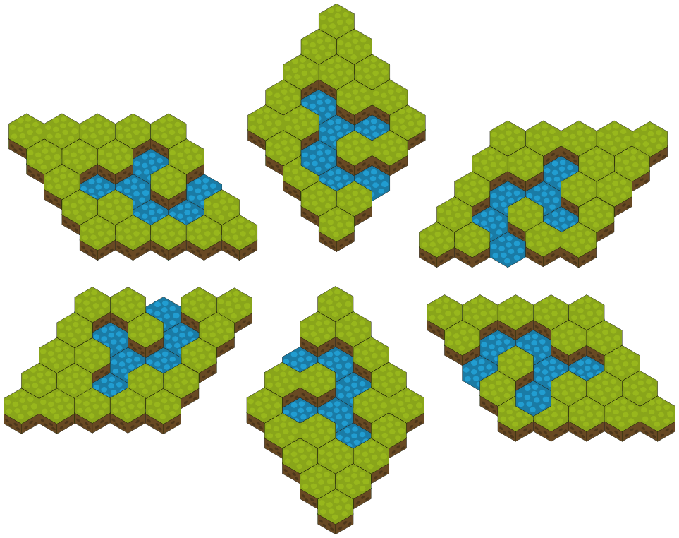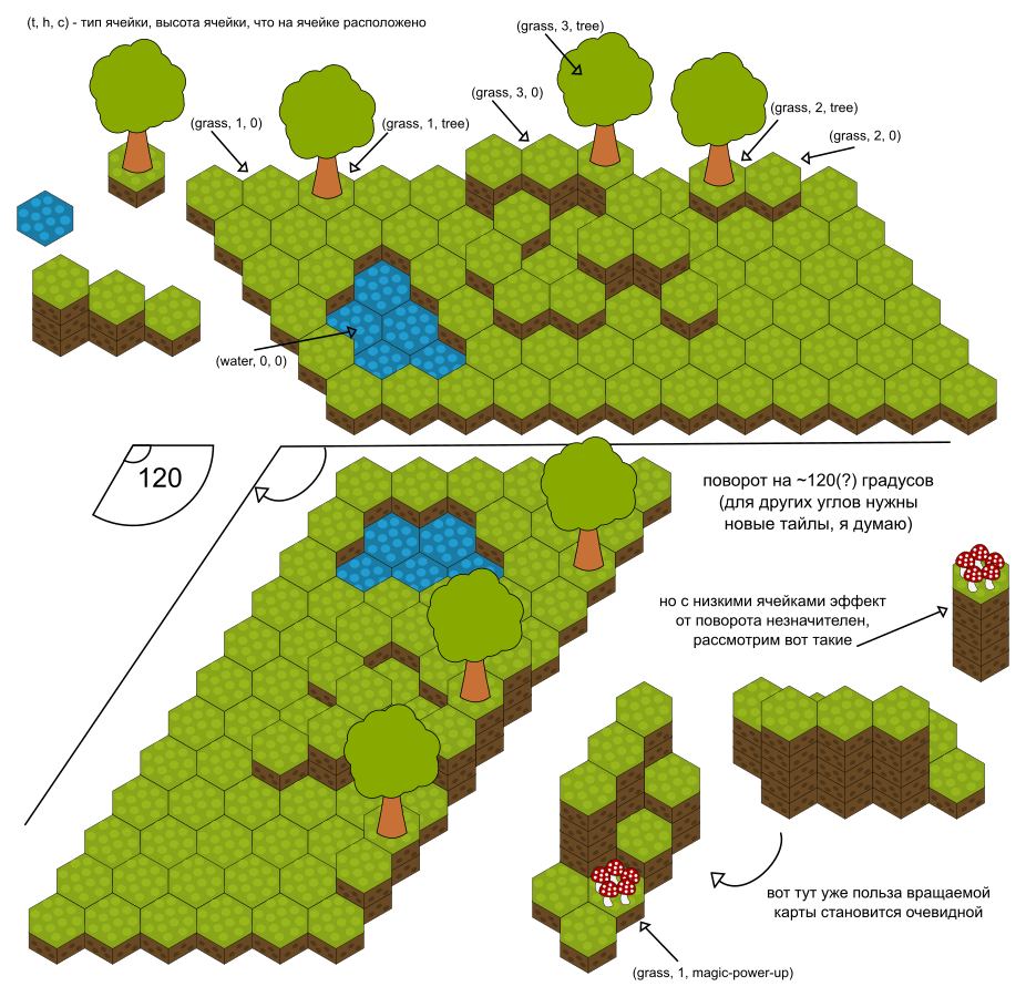 >>679533 >но с шестиугольниками для вращения на все 6 сторон придётся сделать дополнительные тайлы Похоже, я ошибся, новые тайлы нужно рисовать только для вращения на 12 сторон, для вращения на 6 сторон достаточного всего одного набора тайлов. Попробовал вручную повертеть простенькую карту 5x5 - выглядит неплохо (хоть и немного странно), к тому же более-менее разобрался, как такие карты вообще строятся (на интуитивном уровне, лол). Осталось только допилить свой движок под это дело, сделать редактор карт, и можно делоть игоры)