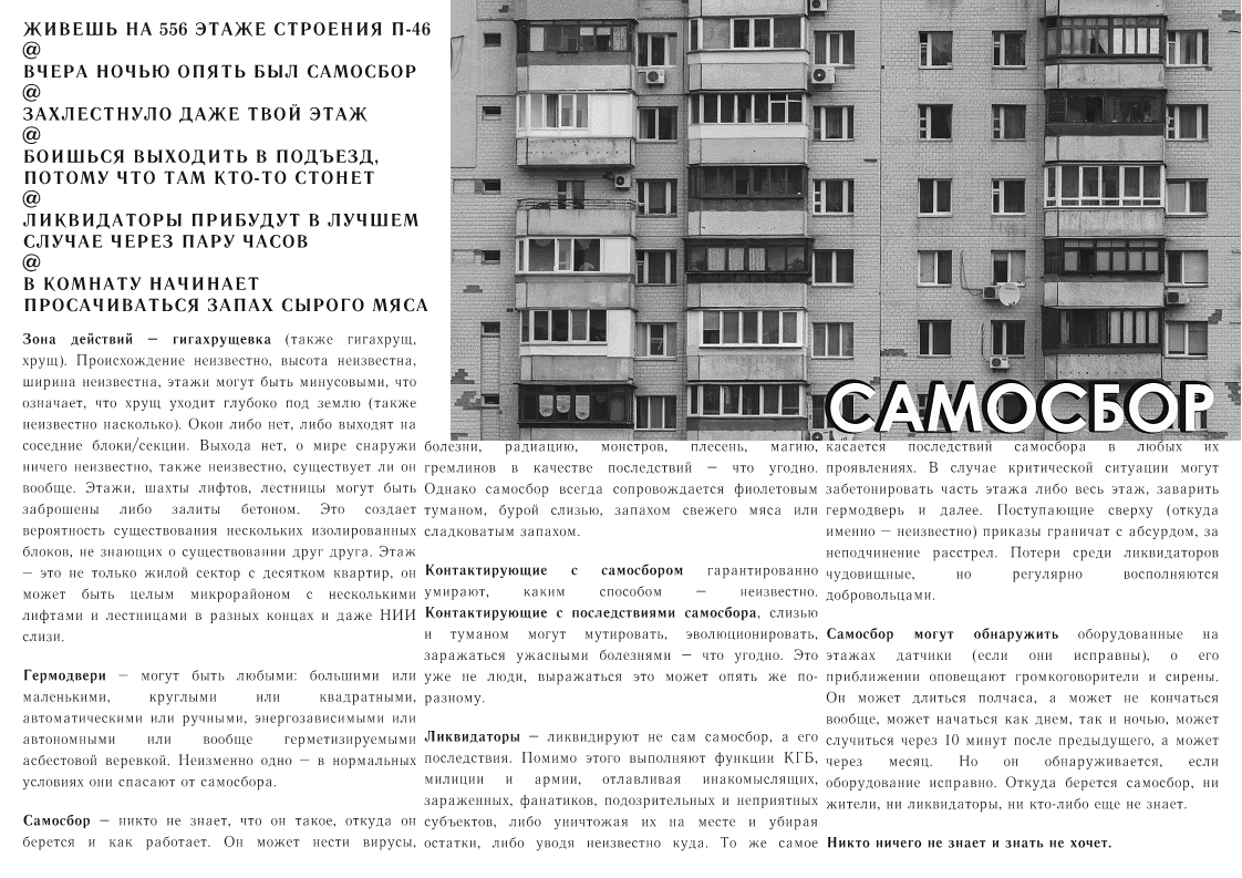 >У нас почему-то все хотят делать YOBA-шутан по самосбору Это связано с самой сутью Самосбора как выдуманной вселенной. Читая и придумывая пасты про этот мир, аноны переживают события от лица каких-то персонажей. Большинство паст, что я видел, написаны от первого лица или о ком-то конкретном, а не в целом о жизни целого блока. Сама атмосфера Гигахруща основана на старых советских домах, эстетике многоэтажных трущоб, возведённой в абсолют. Люди провели своё детство в обшарпанных подъездах панельных многоэтажек и испытывают ностальгию, когда видят что-то похожее. Как это связано с жанром игры? Очень просто.