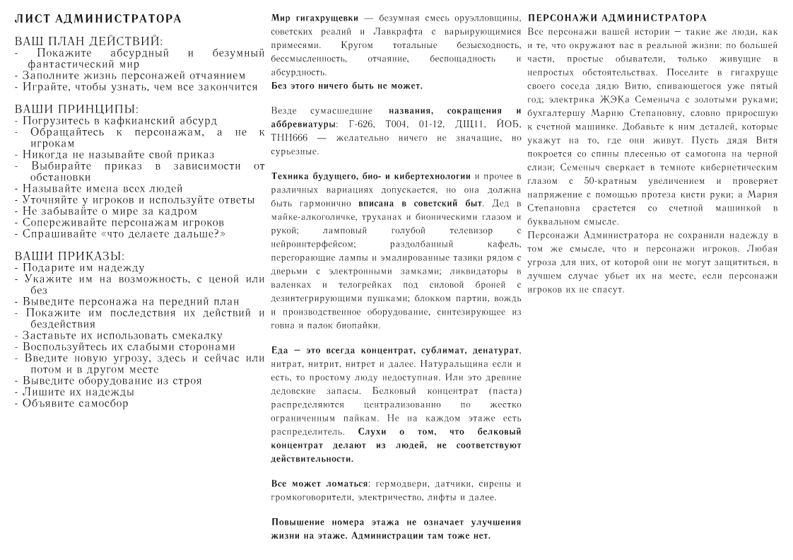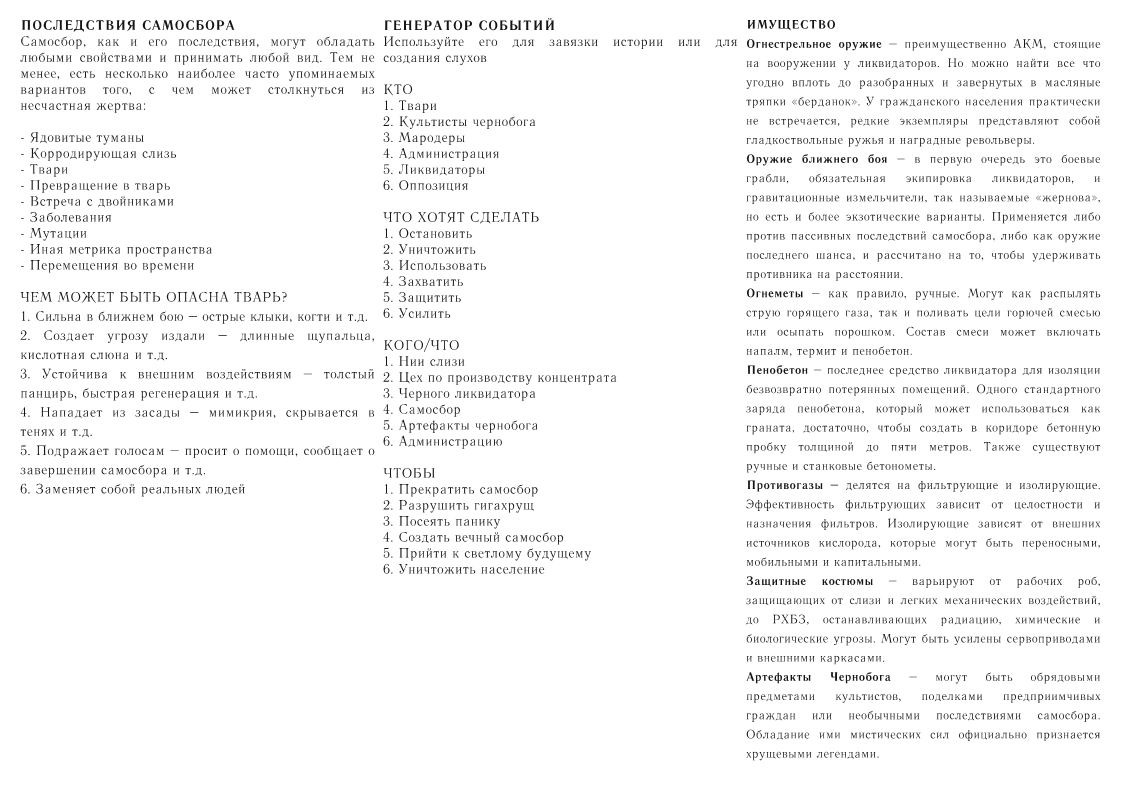 >>647332 Вот еще вариант. Ссылки в шапке https://2ch.hk/sf/res/172063.html на информационные ресурсы. Это справочный материал по необходимому снаряжению для ликвидаторов: Грабли "Победа" - стандартный инструмент каждого ликвидатора. Встречается в двух видах. Стандартные и штык грабли для автомата Ералашникова и винтовки Носина. Применяется для уборки малых скоплений биомасс. Гравиженов ГРН-420 - инструмент для перемалывания крупных объектов, которых не берут огнемет или грабли. Создает небольшие гравитационные диски, между которыми перемалывается цель. Применяется против крупных скоплений биомасс и затвердевших биомассс. Огнемет А-130 " Агния" - стандартный санитарный огенемет для обработки труб и вентиляций. Применяется против малых и средних скоплений биомасс Пенобетонная граната ПГ-6 " Пенка-Генка" - оружие для быстрого создания бетонной стены. Применяется для быстрого запечатывания прохода. Стандартный пистолет Затычкина - табельное оружие офицеров вооруженных сил и милицииликвидаторов. Имеет два режииа стрельбы: одиночный и очередью по три выстрела. Фонарик Улыбка - есть в двух вариантах: нагрудный и подствольный к автомату, винтовке и помповому ружью. Помповое ружье Пушкин - полуавтоматическое ружье для боя в ограниченном пространстве с целью подавление. Предусмотренны следующие боеприпасы.. Дробь, Патрон, ПГ патрон и зажигательные. Боевые ходунки ДРЖ-34 - повышает скорость передвижения бойца, переносимый вес без вреда для мобильности.