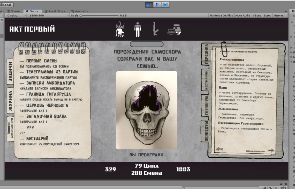 Итак что планируется еще сделать: 1) Доделать тестирования самой игры, заставить работать все стабильно, не исправляя код. Также дописать и дооформит некоторые моменты, которые я не сделал на стадии проектирования. 2) Балансировка геймплея. Буду расставлять контрольные точки в квестах - места где при смерти не будет теряться прогресс. Найти оптимальный баланс между количеством квестовых событий с случайными событиями. Чтобы сюжет не летел быстро или слишком долго не пришлось играть для получения прогресса квеста. Планирую после полного прохождения до 1 концовки сделать Новую игру +, в которой квестовые события будут даваться быстрее, чтобы пройти игру на другие концовки быстрее, чем в первый раз. Сам тестирую на скорость в 3 случайных события на квестовое/qte/баф событие и занимает времени просто море, особенно если читать и думать, чтобы не умереть. Постараюсь сделать прохождение не сильно затянутым, но и не сильно быстрым. 3) Достижения стим и прикручивания Steam Pipe 4) Озвучивание игры. План уже есть. Планируется озвучивание всех персонажей (не речью конечно же, а то игра до 2030 года не выйдет), всякие клики, а также постараюсь сделать озвучку своим голосом (речью) важных событий персонажа Голос в голове. Надеюсь будет круто. Еще фоновая музыка во время игры нужна, не знаю где взять 30-40 минут разных звуков подъезда, возможно оставлю диктофон где-то на заброшке или еще где, чтобы записать атмосферные звуки. Потом нарежу засэмлирую и добавлю в игру. 5) Главное меню и Титры. Ну тут быстро, Главное меню отрисовано, его только загнать в Юнити и раскомановать по сцене. Титры ну как бы это вообще час от силы делать. 6) Также у меня лежит ооочень много листочков с крутыми маленькими идеями всяких фич, чтобы игра еще больше ломала 4 стену и погружала в сюжет и жизнь в Гигахрущевке. Что выполнимо в короткие сроки - сделаю, что будет выглядеть сложным, оставляю для ДЛС. 7) Общее тестирование, пробежимся с художницей по всей игре и убедимся, что все работает. 8) Оформление страницы Стим и выпуск игры + воскресить сайт с продажей ключей П747 (RIGS), там Юмани мне выключили платежный виджет, просят передать информацию в сайте по их правилам.