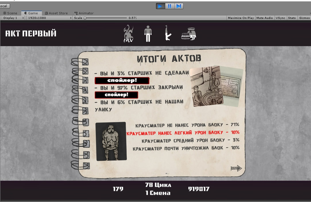 Сейчас работаю над отправкой данных на сервер, когда игрок будет достигать финала актов. Уже сделал для 1 акта. В нем будет 8 ячеек с решениями. На скриншоте примерный вариант как это будет. Над компоновкой текста и картинок планирую поработать вместе с художницей на финальном этапе стилизации и оформления.