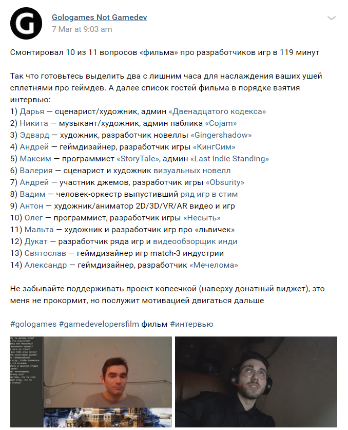 В гостях такие ребята как Никита Коджем, Андрюша Обсурити, Эксель отказался, обзорщик игр с геймдев.ру Дукат, рисователь львичек Мальта из /pa, девушка обитающая иногда в гд и другие кульные ребята не из гд