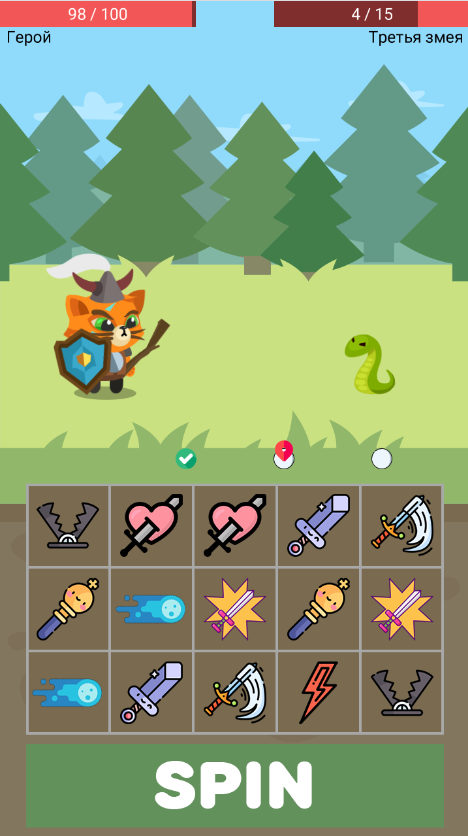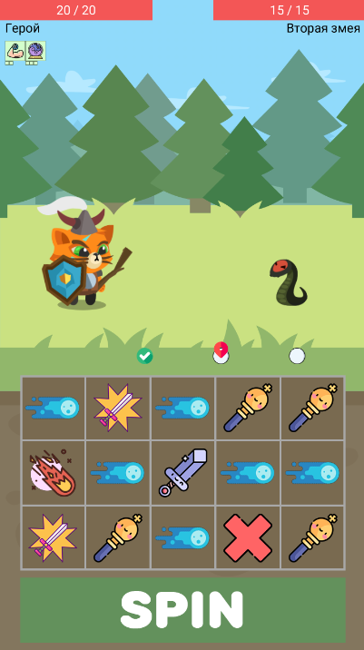 Осталось запилить модуль, который будет показывать че ваще за комбинация выпала игроку и как она сочетается с его атакой (или промахом) и прототип будет готов. Ща котик бьет несколько раз, потому что у него работают все три линии слотов.