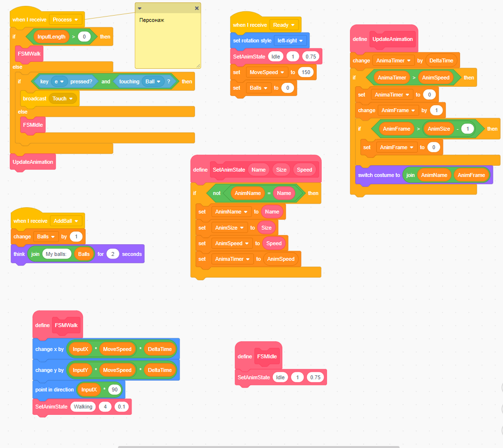 В-третьих, блоки скретча в самой своей сути - это просто подсветка синтаксиса и немного другие ключевые слова обычного текстового кода. Если убрать блоки (которые мне, кстати, не нравятся с эстетической точки зрения), из твоего кода на скретче получится обычный текстовый код. Суть скретча в том, чтобы детям не приходилось бороться с синтаксическими ошибками в коде, когда они случайно забывают поставить точку с запятой, закрыть скобку или сделать отступ в нужном месте. Код в стиле скретча не решает проблему яждизайнера, которому не хочется разбираться в кодинге, но хочется, например, заставить персонажа двигаться.