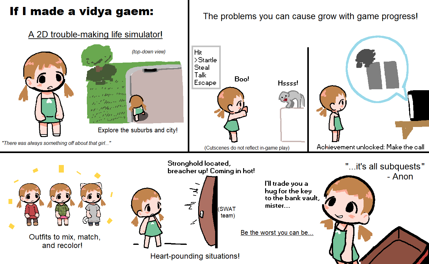 >Чисто нахрапом в стим сейчас залетать не стоит, сперва стоит опробовать себя на геймджемах. Да у меня опыт в игрульках - это только какая-то недостратегия на javascript, пару лет назад делал, за вечер управился. Если и начну, то ~год-два мне только с базовыми вещами разбираться, с анриал/юнити. Про геймджем от тебя узнал. Идея прикольная.