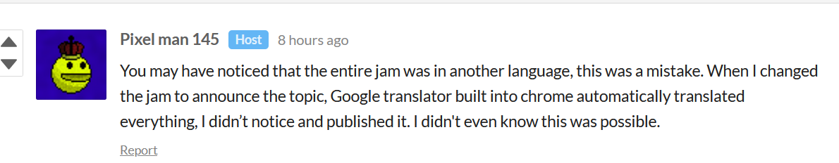 >>879869 Странный он парень. С одной стороны собирает 2,5К на сервер, с другой выкидывает 5К на геймджем. Если что этот сайт ведёт и всё организовывает 1 человек. За упорство ему респект. Надо ему в дикорде написать и пригласить его оргом ТВГ. Прошлый джем он организовал лучше любого ТВГ. Правда игры все были говном, но что поделать, 48 часов это маловато чтобы разогнаться. Думаю двухнедельный конкурс у него вышел бы просто конфетка.