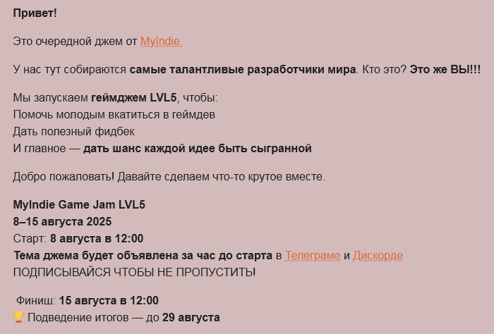 2. Сегодня вечером в нашем дискорде состоится общее мероприятие (https://discord.gg/p784UDb2?event=1402565153928515587) ответов на все возможные вопросы о джеме и небольшой сбор команд для тех кто остался без команды. Залетайте и подписывайтесь на мероприятие чтобы не забыть!