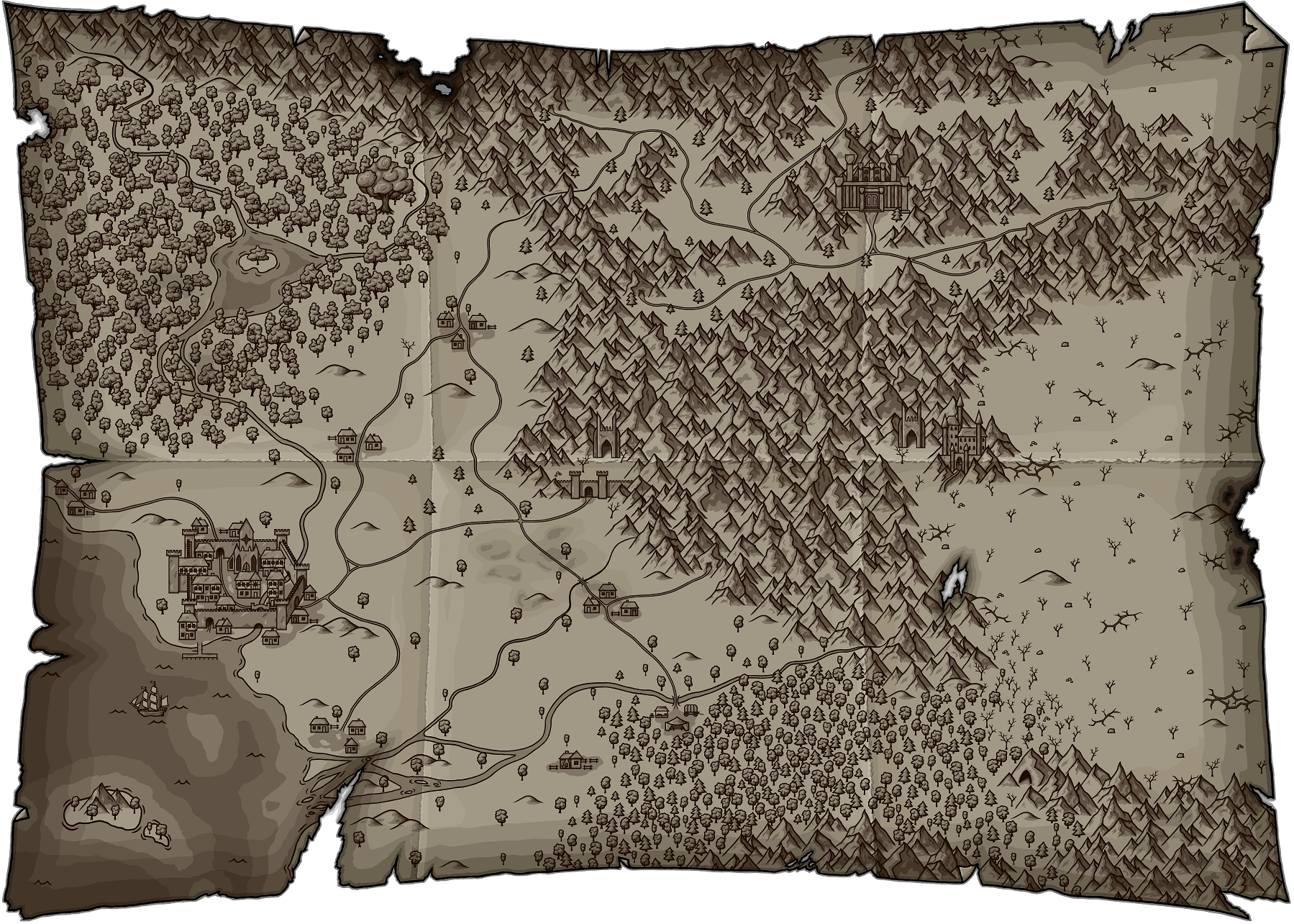 Ну что, я обещался как-то запилить карту - так вот она. Пока что только сама картинка, но я уже занимаюсь запланированной интерактивностью - подразумевается возможность выбора стадий и игровых режимов, а также отображение текущего прогресса прохождения игры. Должен сказать, задача была довольно интересной, и благодаря её выполнению мир игры в моей голове стал ощутимо чётче и подробнее. Хотя рисовать все эти горы, деревья и домики я под конец изрядно задолбался - не в последнюю очередь потому, что в отличие от большей части остального контента, карту я пилил сразу на всю игру, а не только на первую главу, иначе без полной картины потом бы ещё на десять раз пришлось её переделывать.