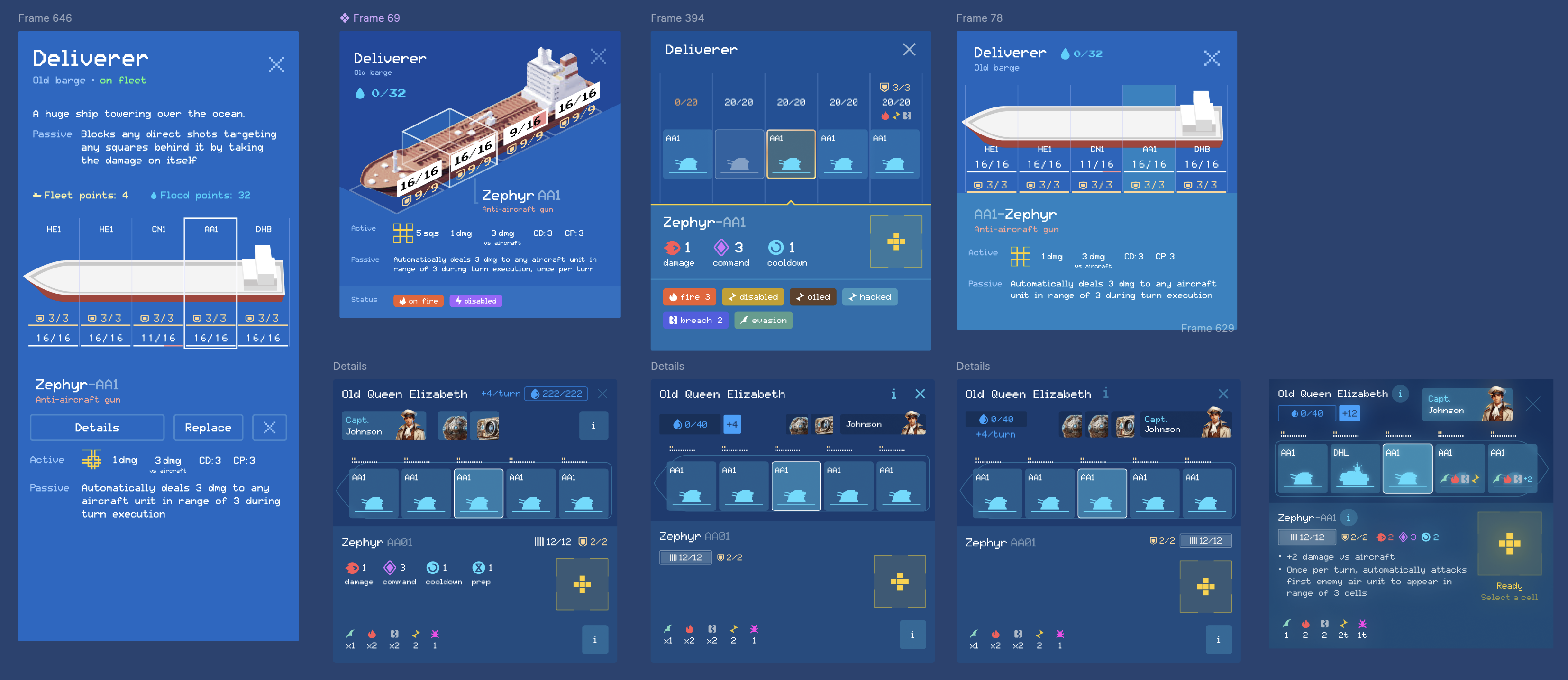 Вообще это все конечно оказалось несколько сложнее, у меня в голове концепция выглядела очень ясно и просто - что может быть проще чем морской бой ну и плюс каждая клеточка корабля это не просто клеточка, а модуль со своей способностью. И также мне казалось что будучи мега-наносеком айтишным продуктовым дизайнером я легко левой ногой нарисую классный интерфейс, который легко адаптирую и под десктоп и под мобилу, но в итоге я колбасился с ним так долго как ни с чем наверное не колбасился. Просто посмотрите какое количество итераций одного-единственного окошка мне потребовалось, например, и тут на картинке где-то 20% от их общего количества, которое я пробовал.