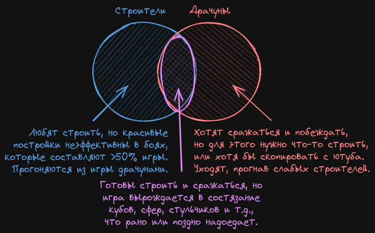 Наивно можно предположить, что сделав сложную композицию двух механик мы расширяем ЦА игры, однако, в данном случае возникает конфликт, из-за которого ЦА сокращается до объёма, значительно меньшего, чем если бы механика была только одна.