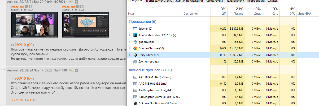>>978249 >идимо я чето перемудрил с кодом Не факт, особенно если работать больше пары часов юнька просто может с нихуя, загибаем пальцы: 1. Крашнуться (Это тащемта БАЗА) 2. Появится утечка спермы (И эдитор станет жрать 999гб что нахуй начнет весить систему) 3. Родить пару/хуеву тучу внезапных красных ошибок, просто с нихуя (лечится простым перезапуском) 4. Родить тоже самое но уже желтых ошибок (все это либо не ссылается никуда при клике, либо во внутренние дллки) 5. Начать артефачить визуально, 6. Внезапно нахуй как у тебя на пике просто зависнуть, на разных этапах 7. Ща будет ультра редкий баг, мб и никто не встречал, но было два раза такое что происходит непонятное поведение что приводит к падению игры, но при повторном запуске сразу уже пропадает