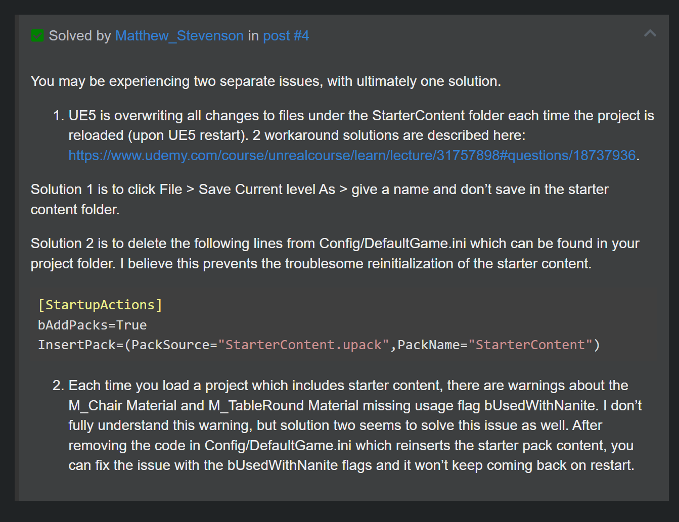 >>966719 Ага, еще меня не хило так подставило когда я удалил класс в плюсах. Причем делал все аккуратно. Имел промежуточный блюпринт класс наследник, от которого уже наследовал остальное. Перепаретнил промежуточник на другой класс. Чекнул все 10 раз, что реально перепарентилось сохранился. Закрыл анрил, удалил в студии ненужный класс, потом в эксплоррере удаллил эти файлы. Закрыл студию, перегененрил студио проет. Зупаскаю, пересобираю, открываю проект - ни один виджет который наследовался о тстарого класса, в том числе и промежуточник не открывается. Пишет что унаследованно от инвалид класса. По ПКМ нет никакх опций чтобы перепаренить в контентбраузере. В итоге на выброс промежуточник и наследников.