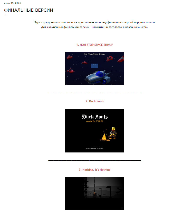 Список присланных на 17.07.2024 18:40 по МСК финалок: Странный старт Chasing the void (В погоне за пустотой) Nothing, it's Nothing Bellydog Abyss 2 Duck Souls Disorder at the Border Проклятье биты Anon in the Shell Зверь Час Икс: Побег (Hour X: Escape) Перед тобой коридор без конца, что ты не видишь? Курьерский синдром TWG: UNITED (ВСЕ В СБОРЕ) NON STOP SPACE SHMUP ААА ОПОЗДУН Prehistoric Beats Spirit and Heroes Автостоп