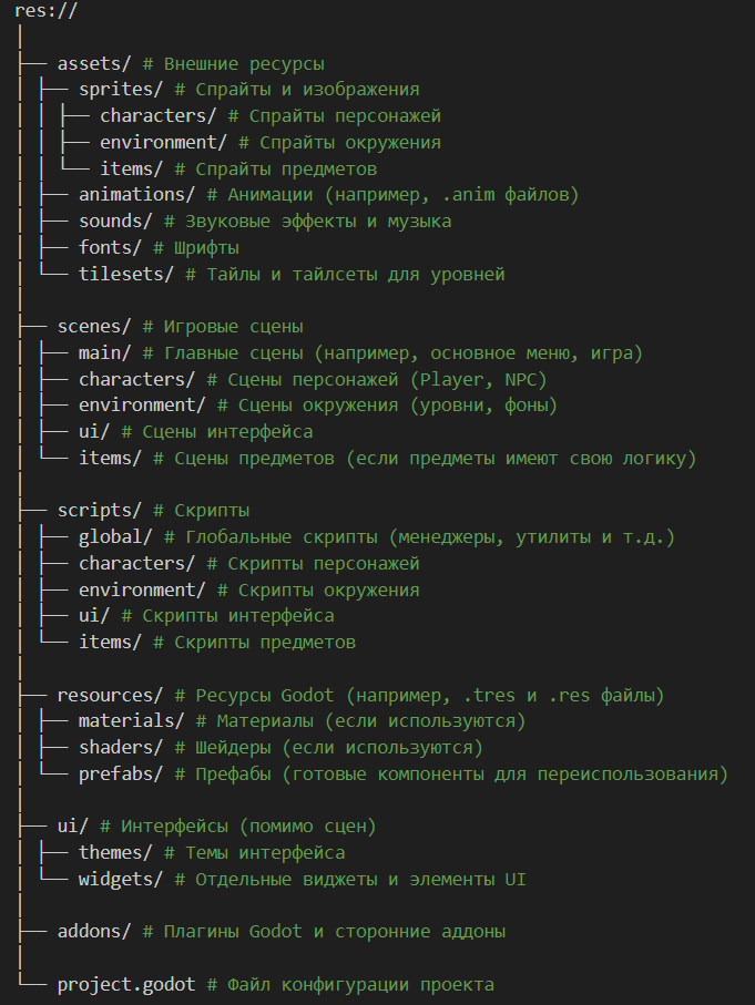 6. Свои Node. Абстрагируемся от данных, делаем потомки Node и размещаем их в дереве сцен. Сцены можно потом комбинировать, создавая структуры уровнем выше. + Нет сторонних зависимостей кроме Godot. + Доступна вся мощь системы нод и сцен Godot. + Проще добавлять ресурсы в ноды, чем в ресурсы. + У нод порядок с иерархией => видно ветвление. + Можно добавить кастомные иконки нодам. + Легче менеджмент загрузки/выгрузки сцен игры. + Сцены есть сцены, а не абстрактный велосипед. + Удобнее и надёжнее супер-вложенных ресурсов. + The Godot Way™, если я правильно понимаю... - Сцены сложно редактировать в Блокноте. Лол. Но можно написать транслятор из сценарного языка.