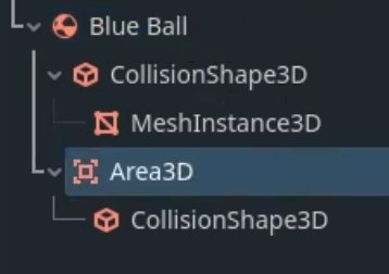 >>971256 Для новичков пойдет. Blu Ball - ригид боди, CollisionShape - его коллизия. Area3D - отдельный треггер для чего нибудь, например хитбокса. MeshInstance3D - визуал мяча.