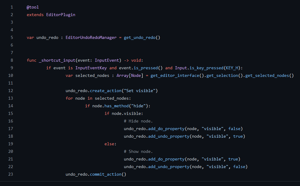4. Код на GDScript. Т.е. буквально ООП-велосипед, прямо на GDScript. + Нет сторонних зависимостей кроме Godot. + Нет оверхеда на парсинг сторонних скриптов. + Доступно автодополнение, типизация, дебаггер. + Можно сделать ctrl+клик, писать документацию. + При желании пиши хоть в простейшем редакторе. - Много бойлерплейта по типу: godette.says("hi"). - Навигация не сильно проще кастомного языка. - Чуть сложнее для писак, рисовак, дисигнеров...