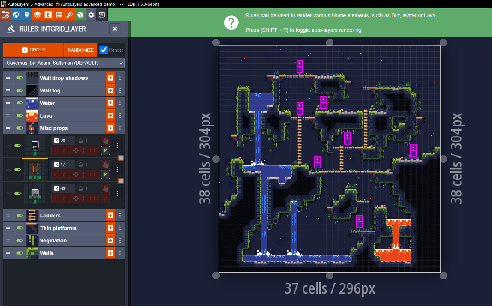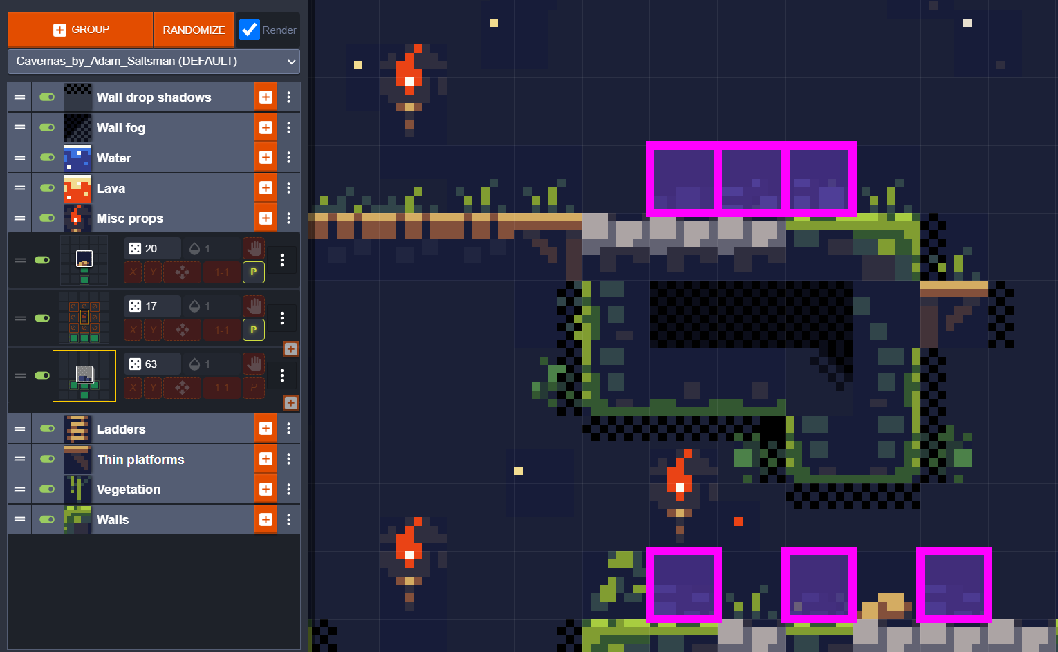 >>972868 интерьер комнаты можно обставлять автоматом с правилами, или графом. Автомат с правилами скорее всего однопроходный или малопроходный (не требует сотен поколений как клеточный). Можешь посмотреть например редактор LdTK. В примере, факел ставится в клетку над полом, вокругой которой ничего нет. А синие камушки - в клетку над T, то есть над полом в 2 толщины (не мостиком), и не над углом/краем платформы, + там рандомизатор спавна. Это можно совместить с упомянутым тобой бюджетьом. Вариант с графами, это генерация графа уровня, она описана во всяких пейперах. Желательно это совместить с генерацией пещеры, как то. Объекты распологать в комнатах.