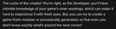 >>972868 >генерировать контент внутри уровня Отвечаешь сам себе на вопросы вроде таких: - зачем игроку проходить уровень? - в чём фан прохождения уровня? - что игрок должен получить? - какие испытания пройти? И т.д. Избавляешься от неопределённости. Тут хорошо может помочь чатбот, только попроси задавать тебе больше наводящих вопросов по теме.