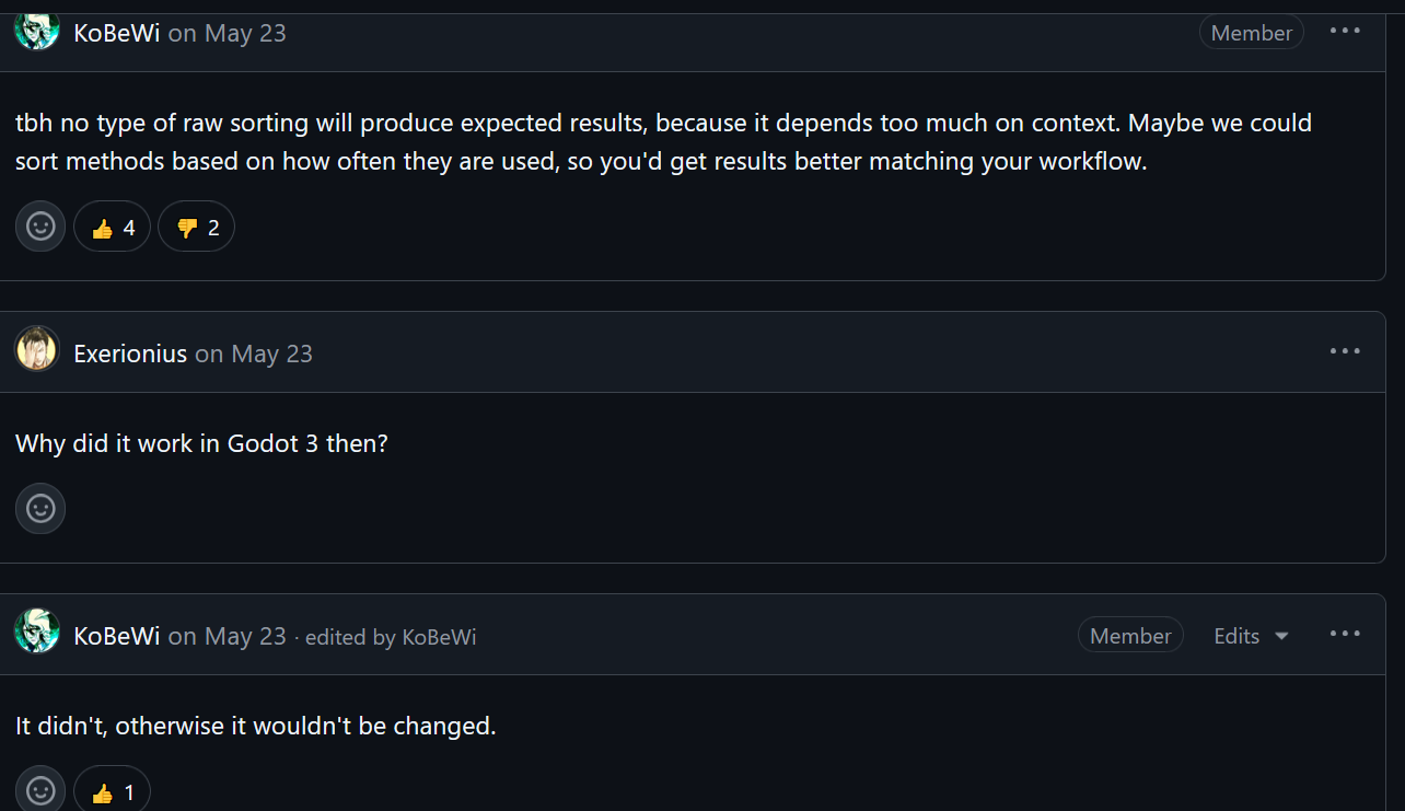 >С обсуждением, почему откатывать не нужно. >Calinou changed the title Change autocompletion sort order to purely alphabetical or give an option for it in settings. Change autocompletion sort order to be purely alphabetical or add an editor setting for it on May 23 Тащемта да, откатывать не нужно, нужна опция. Хотя я не видел в интернетах ни одного довольного новой сортировкой, но вот недовольных хватает. Это повод задуматься.