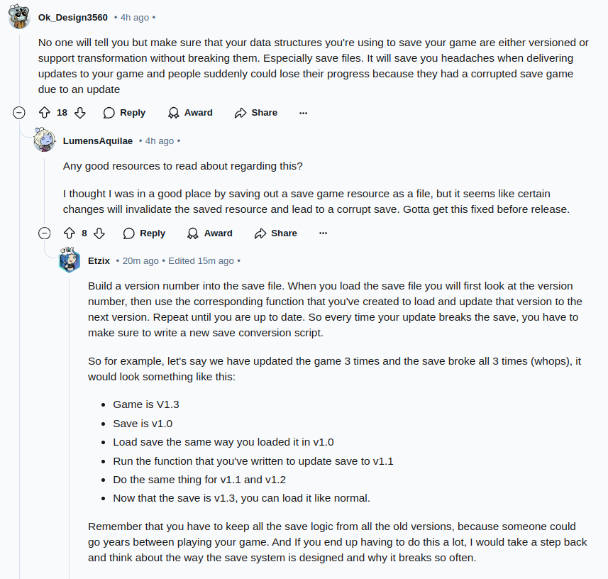 >>989737 >ты просто охренеешь от сложности внутренних систем, где ты неизбежно будешь копаться и что-то менять. А эти внутренние системы отражают мышление автора, отличающееся от твоего. Да, бывает. Вчера был шокирован тем, как я четырехмесячной давности изящно реализовал один очень нужный мне алгоритм. В прошлый раз я этот код отложил, а вчера вот он резко понадобился. Передо мной был гдскрипт, но я так ничего и не понял. А уж чего говорить про чужой код.
