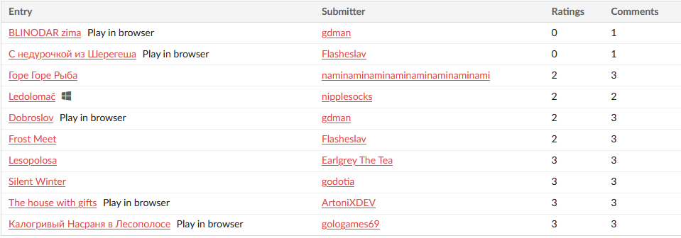 Я проголосовал, но коменты ич сожрал. Так что по памяти Лесополоса - клевый дизайн эффектов. Но разметка странно движется при езде, я даже не был уверен что поехал. Хотя вроде завелось. Жаль нельзя в деревья врезаться Рыба - в виртуалке пришлось запускать opengl, а там чет человечки не убивались. Я дошел до куда смог протискиваясь между вальсирующими монстрами. В визуально новельной части, сделай промотку текста, а не его скип. Чтобы сразу все предложение до конца выводилось. Ледоруб - приятно, что позаботился об игроке, и есть автокопание. Атмосферно, но ходить надоедает. С другой стороны а как еще показать атмосферность. Можно вьюгу добавить и чтоб толкала. В дверь трудно попасть, вроде подсвечена вся, а работает ручка. Хотелось пообследовать мир по бокам, думал что будет что-то с деревом. Шаманизм в конце не смог расшифровать. Че там еще было. А, насраня мое почтение, такое созвездие твгшек. Достойное использование вычислительных мощностей. Недурочку не смог перепрыгнуть сугробы.
