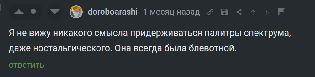 почитал конец треда, я думал кто-то детей потрошить предлагает перед тем как их ебать, а речь всего-то о чуваке, который палитру спектрума блевотной назвал и собак хейтит
