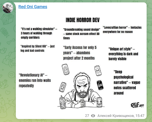 Соболезнующие: Че вам надо от инженероа по коду? Я бы рассмотрел кооперацию с вами только в случае, если у вас уже есть нормальный воркфлоу по ассетам / сюжету (именно сюжету, плот, твисты, или если вы контент креатор, чтобы все уже звукосниматели были). мне промтить западло всё это, вспоминать драм машины, арпеджио в фл студии итд.
