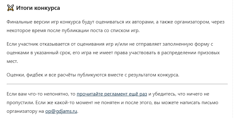 Так что в итоге по регламенту? Какая система оценок-то будет? Раньше в регламенте было написано, что правила будут написаны до начала конкурса, теперь эту надпись убрали, но как будут оцениваться игры так и не написано.