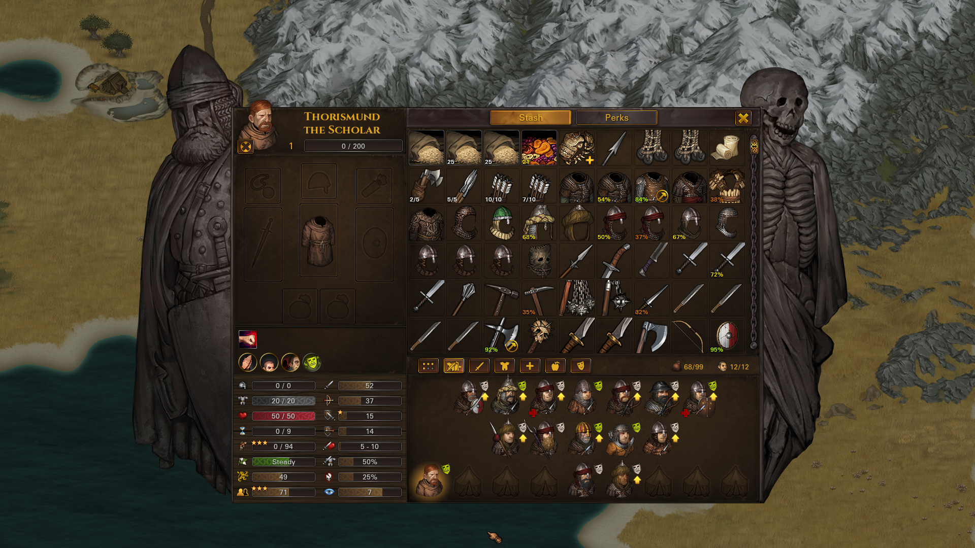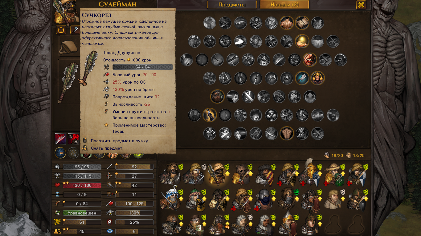Покопался в файлах, легендарную валыну новую нашёл. Censer of the Diviner (Кадило Предсказателя) Урон 60-110 Игнор брони 30% Урон по броне 110% Шанс в голову попасть +15% Бьёт на 2(!) клетки и срёт миазмой. Что-то на уровне обычного двуручного флеила только на две клетки бьет и миазму вешает на тайл куда ударяет на 3 хода. Еще пробития брони бонусного нет если в голову попадаешь как у обычного.