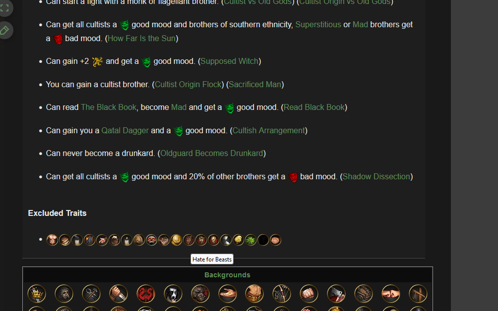 Новые зелья для анатомистов. Зелье меньшего голема из плоти - даёт один положительный трейт. Зелье большего голема из плоти - даёт два положительных трейта. Список возможных трейтов - +5 мдефа, +5 матаки, +10 хп или фатиги или резолва, железные легкие, +10 ини ну и всякий треш типа тимплееров, удачливый, лояльный ненависть к разным мразям, и т.д. короче рандом из всех положительных. Зелье Великого Предсказателя - даёт экспы на 10 уровней, хз работает ли на ветеранские уровни.