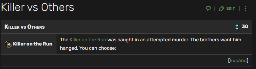 >>1289027 >Там основная фишка это повышенный шанс дропа лута, а не караваны. Караваны можно кем угодно грабить. Я это понимаю, но рп ради хочется грабить корованы, а не стартовых бомжей гонять. >Надо в резерве таскать три тела на забой. Три раба, чтобы не конвертнуло челов на жертву, я до этого быстра додумался, но проблема в их рандомности, то 20 дней таскаемся с 0 ивентов на конверт и жертву, то я найму к стартовым братанам милиционера и жертва выпадает на 6ой день. Очень медленный старт, пока культистов по деревням насосёшь, пока ждёшь ивента у таверны, чтобы нужные челы не ливнули, мне супер не понравилось, хотя стилистически вся эта темка с жертвами мне очень нравиться, до последнего пытался на них играть. >запас порошка счастья Ну это явно не в первый месяц игры. >Лон вульф-полное говно. Поясни. Не люблю старты с крутой экипой в самом начале. Прогрессия игры сделана из расчета старта за бомжей. А лонвульф худший из этих стартов, он супер имбовый и одинокий, игра сделанна для игры групкой плавнопрогресирующих бомжиков.