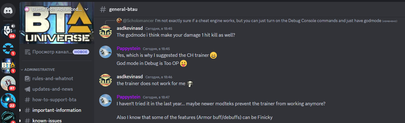 ЛОКАЛИЗАЦИЯ МОДА #BTA Universe v19.5 (версия перевода Universe 19.5.r1): — Оптимизация перевода BTA Universe версии 19.5 — Исправление описания кланового меха Vapor Eagle VGL-2 (спасибо за наводку Илье Свердюкову) — Различные мелкие исправления перевода https://vk.com/bta3062