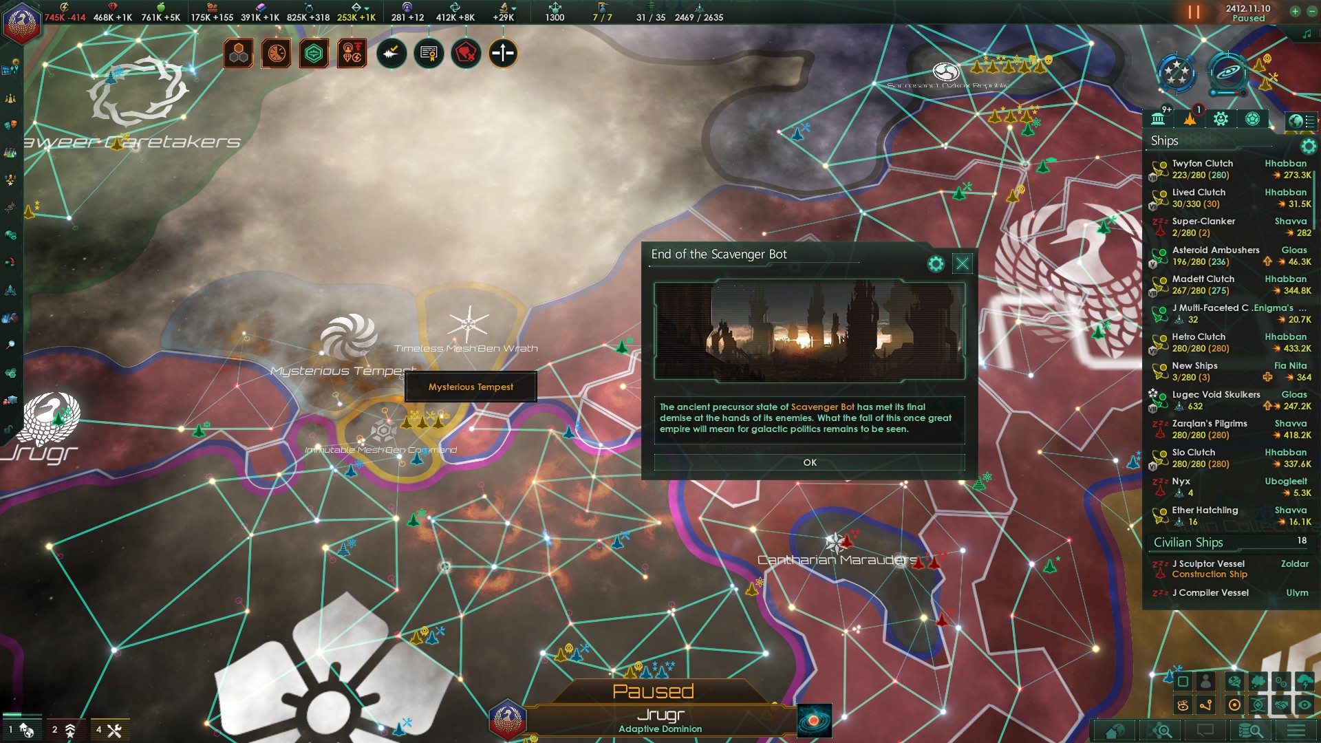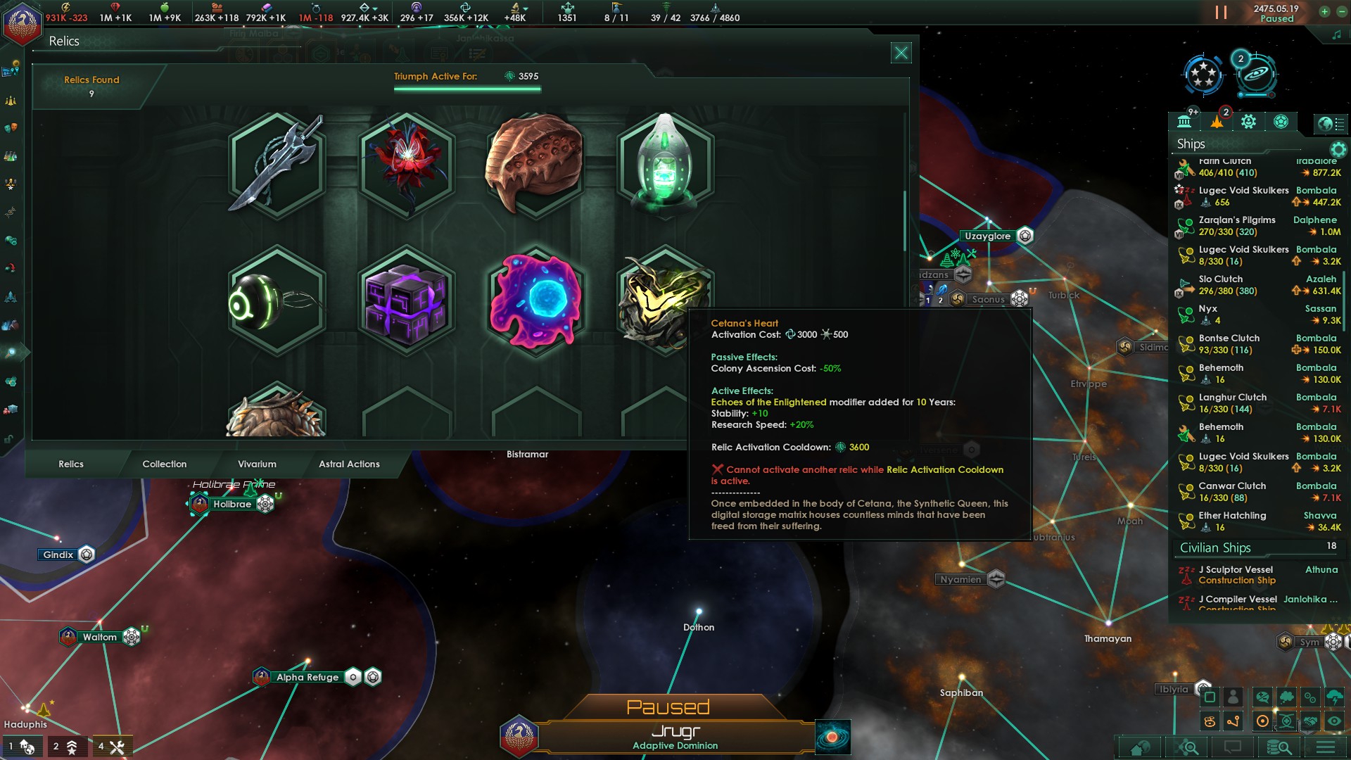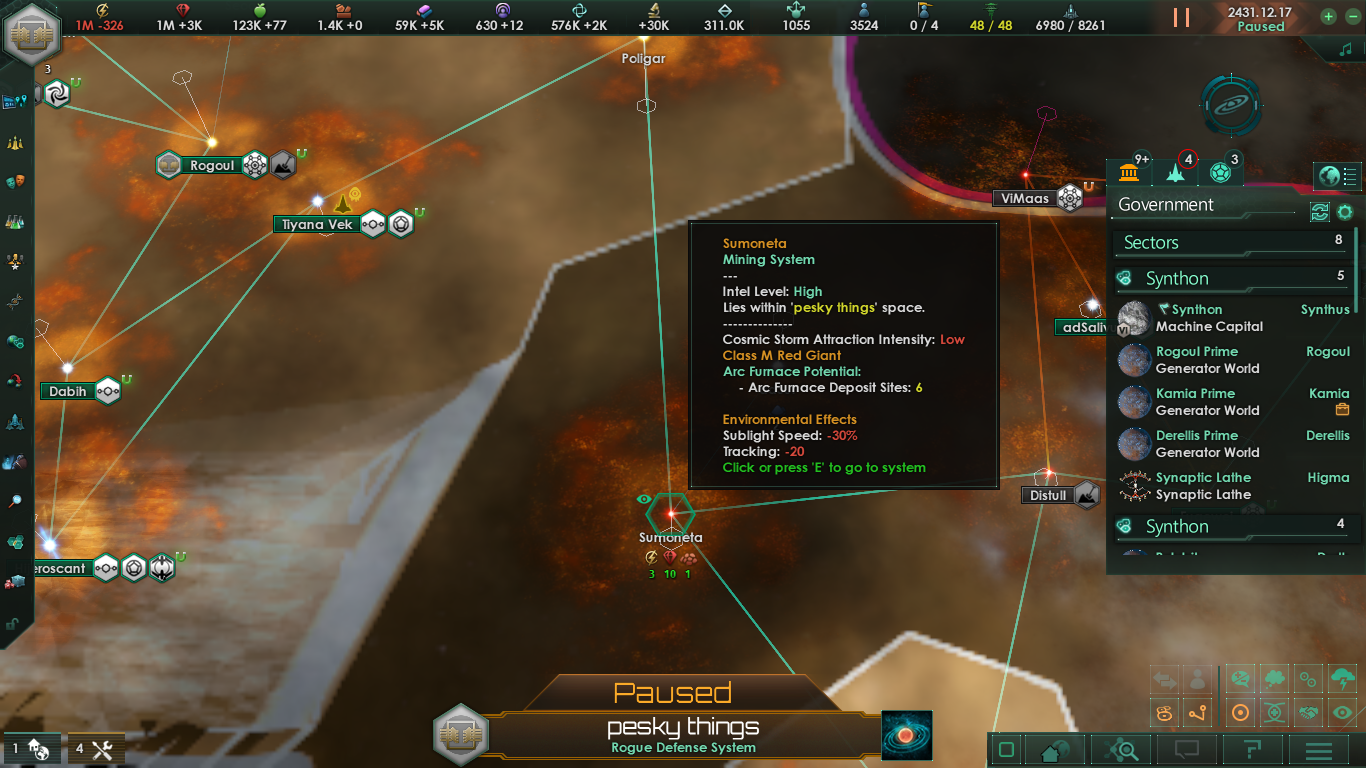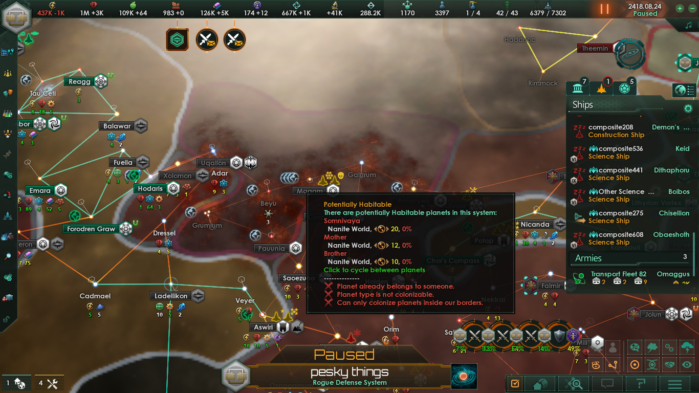 >>1291868 Перенос столицы - скорее всего дело в секторах, столица будет столицей столичного сектора, а столица сектора не может быть слишком близко к столице другого сектора. Попробуй временно удалить сектор(а) поблизости от твоей будущей столицы. Завершитель цикла выпадает с очень маленьким шансом, надо или очень много играть или сейвскамить как сука. Я помню из какого-то патчноута что шанс завершителя увеличивается в пять раз если в галактике кто-то (не ты) взял перк кризиса, не знаю актуально ли это еще. Само сообщение о завершителе выглядит как предложение пиздец могущества +100% ко всему с намёком что цена будет страшной, у кнопки согласия написано красным "не делай этого".