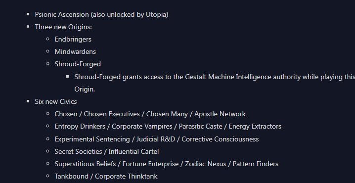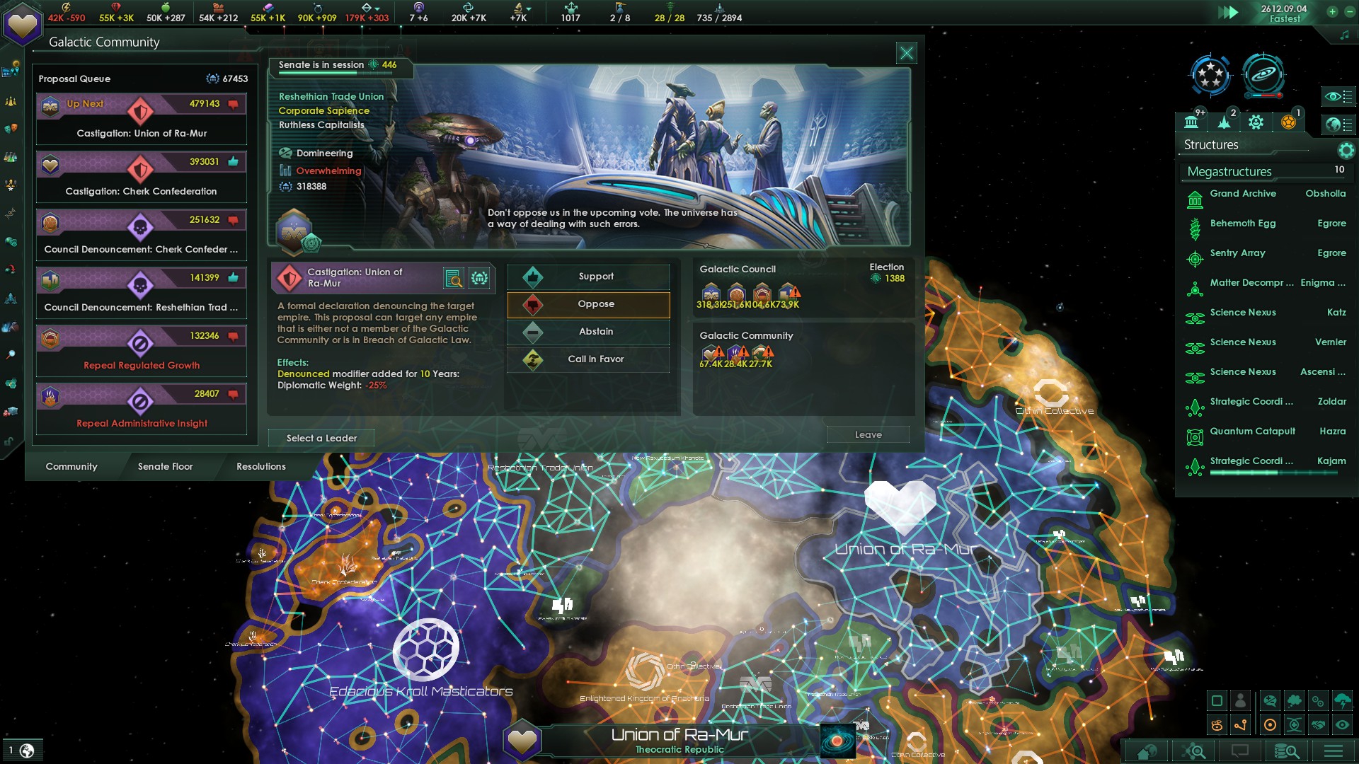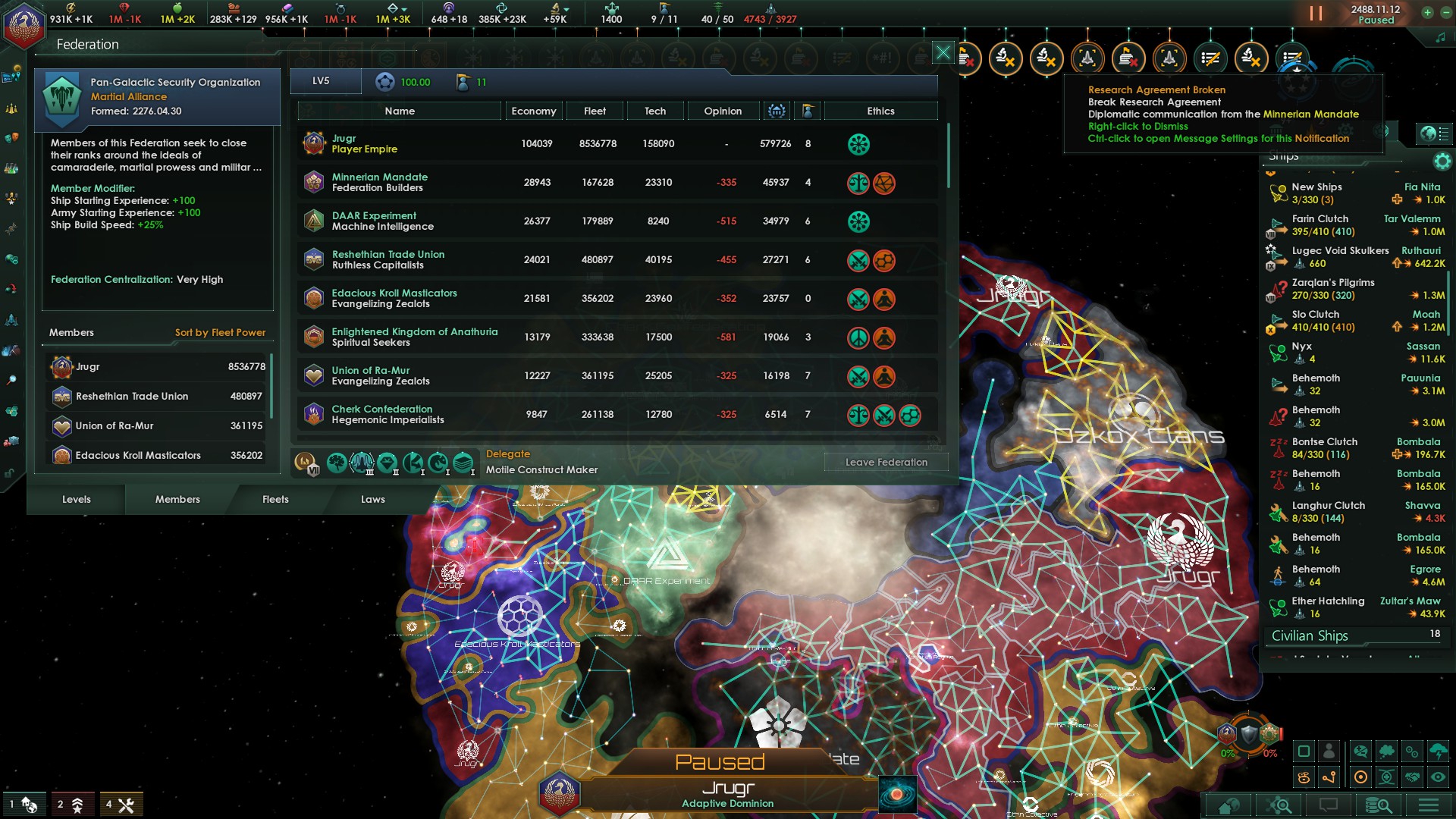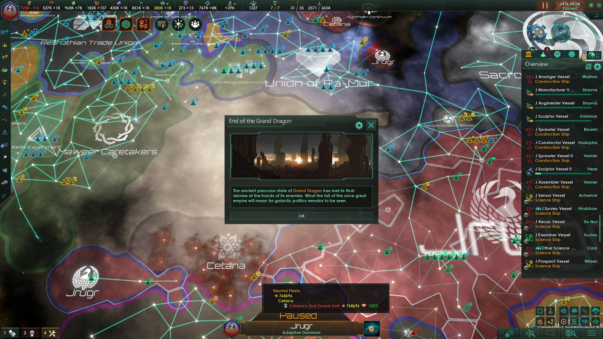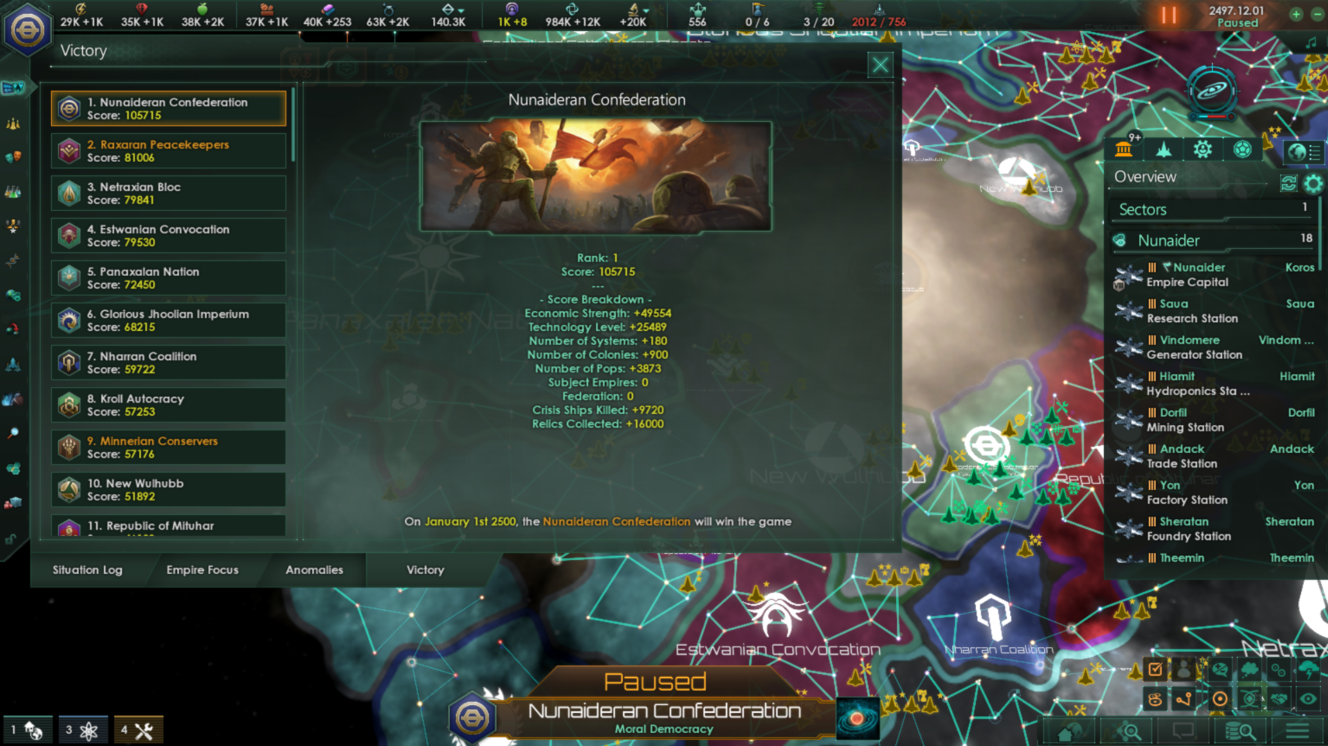>>1291868 Перенос столицы - скорее всего дело в секторах, столица будет столицей столичного сектора, а столица сектора не может быть слишком близко к столице другого сектора. Попробуй временно удалить сектор(а) поблизости от твоей будущей столицы. Завершитель цикла выпадает с очень маленьким шансом, надо или очень много играть или сейвскамить как сука. Я помню из какого-то патчноута что шанс завершителя увеличивается в пять раз если в галактике кто-то (не ты) взял перк кризиса, не знаю актуально ли это еще. Само сообщение о завершителе выглядит как предложение пиздец могущества +100% ко всему с намёком что цена будет страшной, у кнопки согласия написано красным "не делай этого".