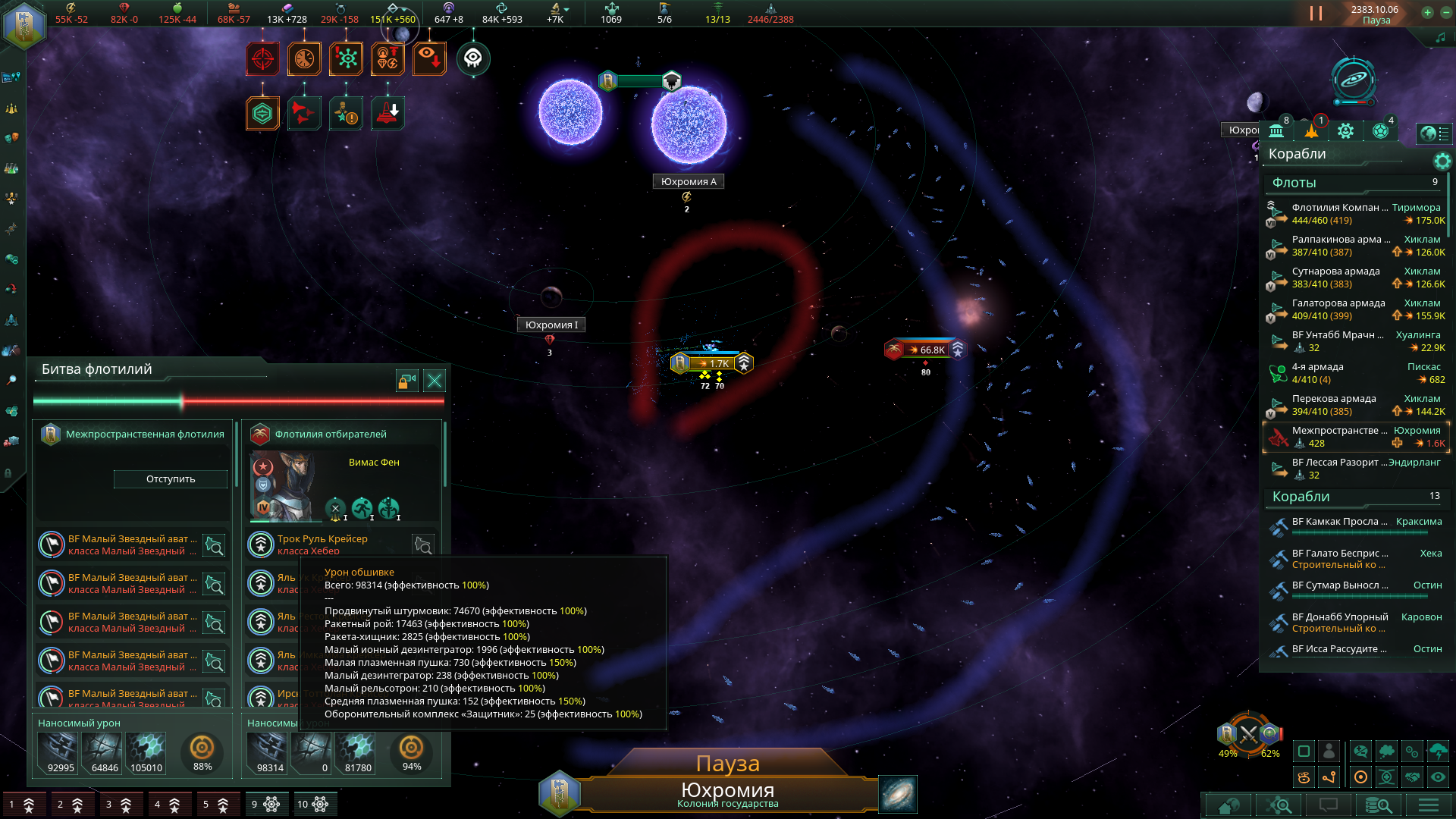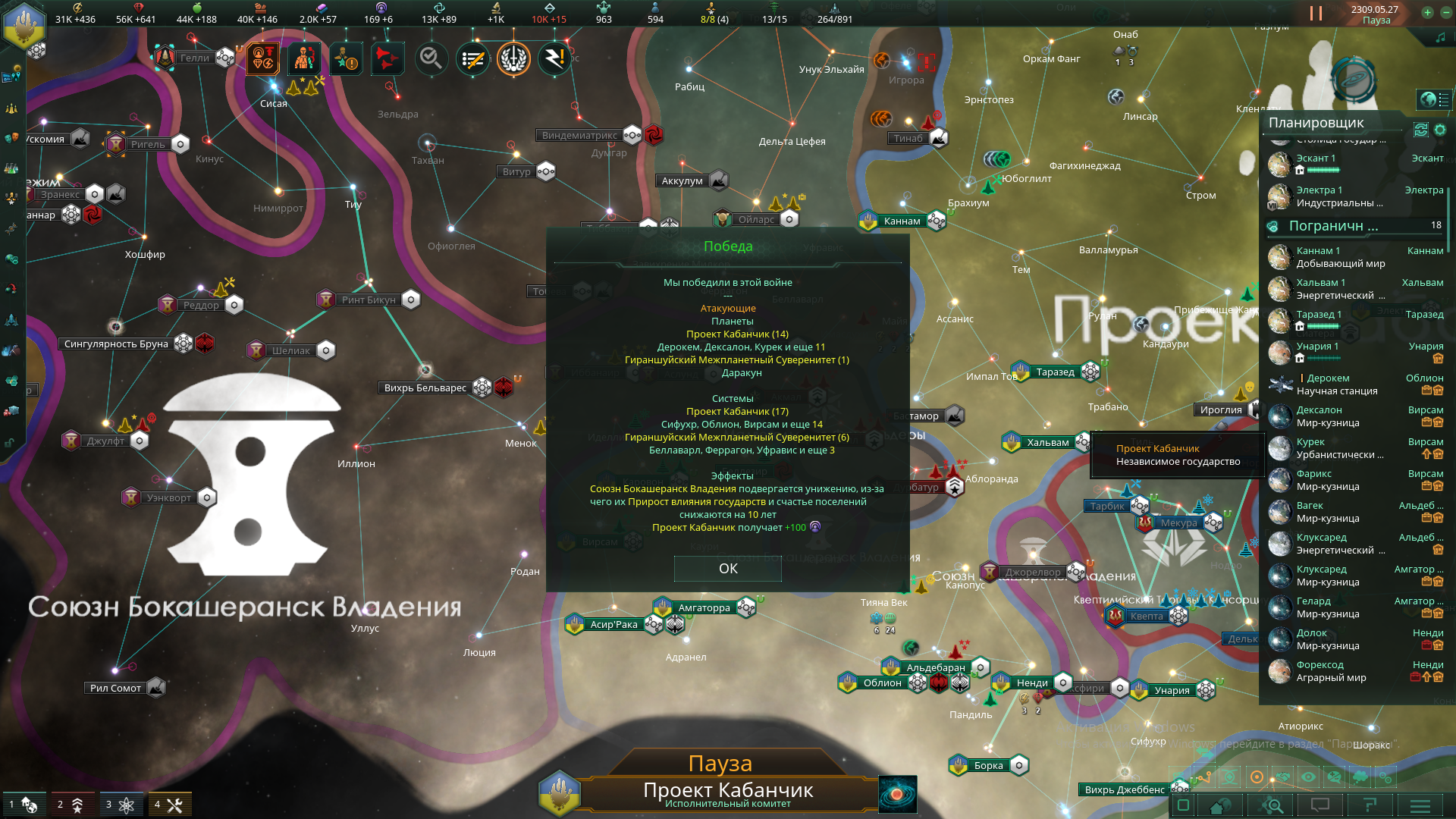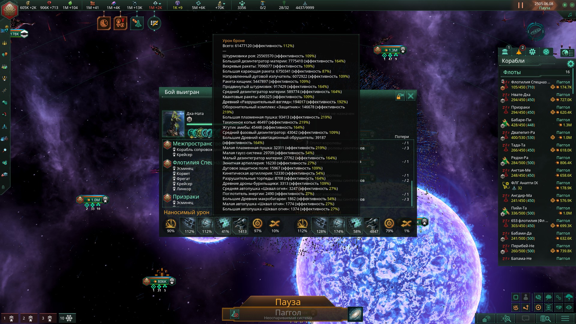 >>1298193 Хан прошёл полгалактики, собрал 680к, намотался на 550к фоллена и сдох, развалившись на две патетик пахомии. Спасибо, очень вкусно! Он еще и ликвидировал на корню мощную педерацию которая передавливала меня и красила моего вассала.