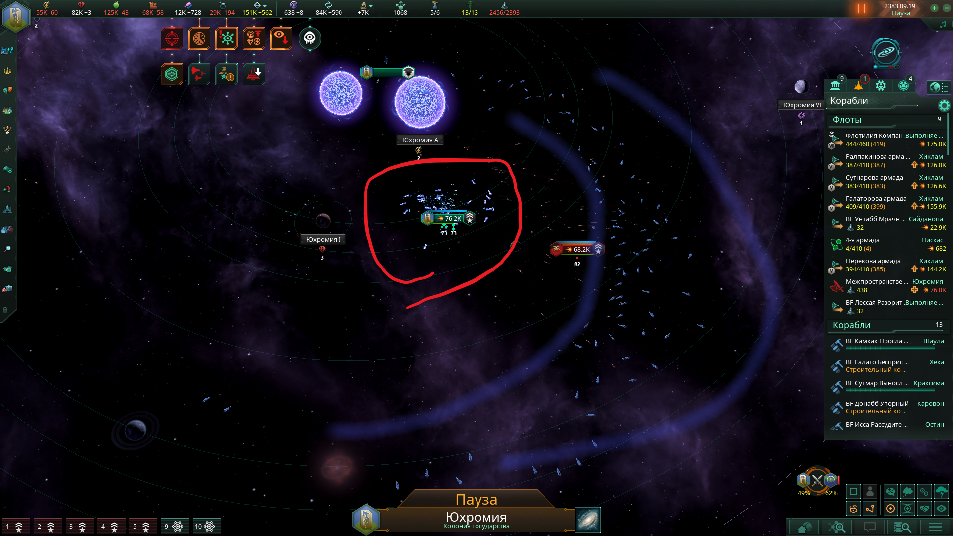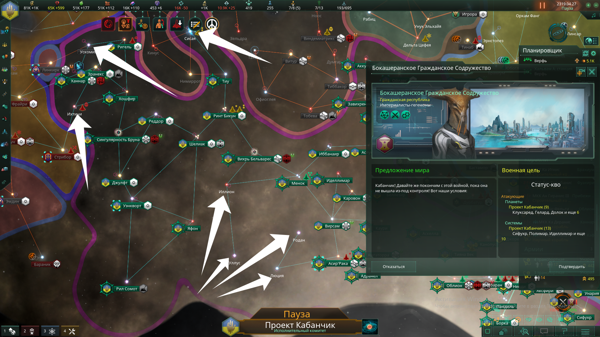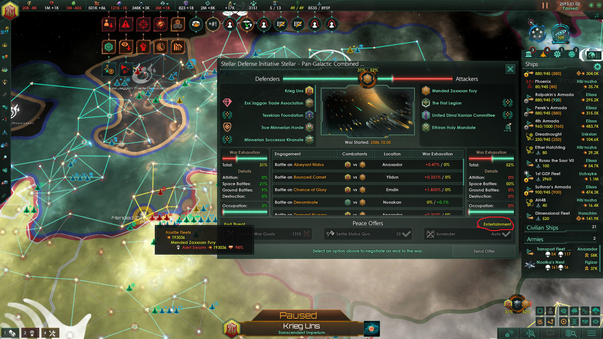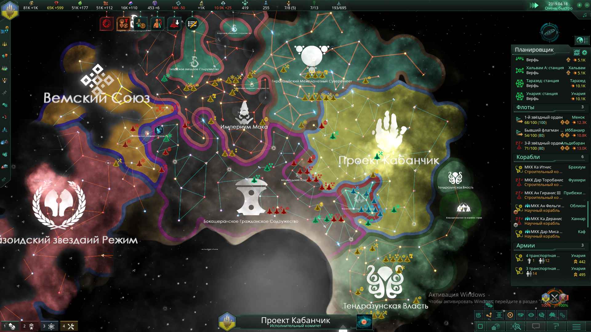 >>1298193 Хан прошёл полгалактики, собрал 680к, намотался на 550к фоллена и сдох, развалившись на две патетик пахомии. Спасибо, очень вкусно! Он еще и ликвидировал на корню мощную педерацию которая передавливала меня и красила моего вассала.