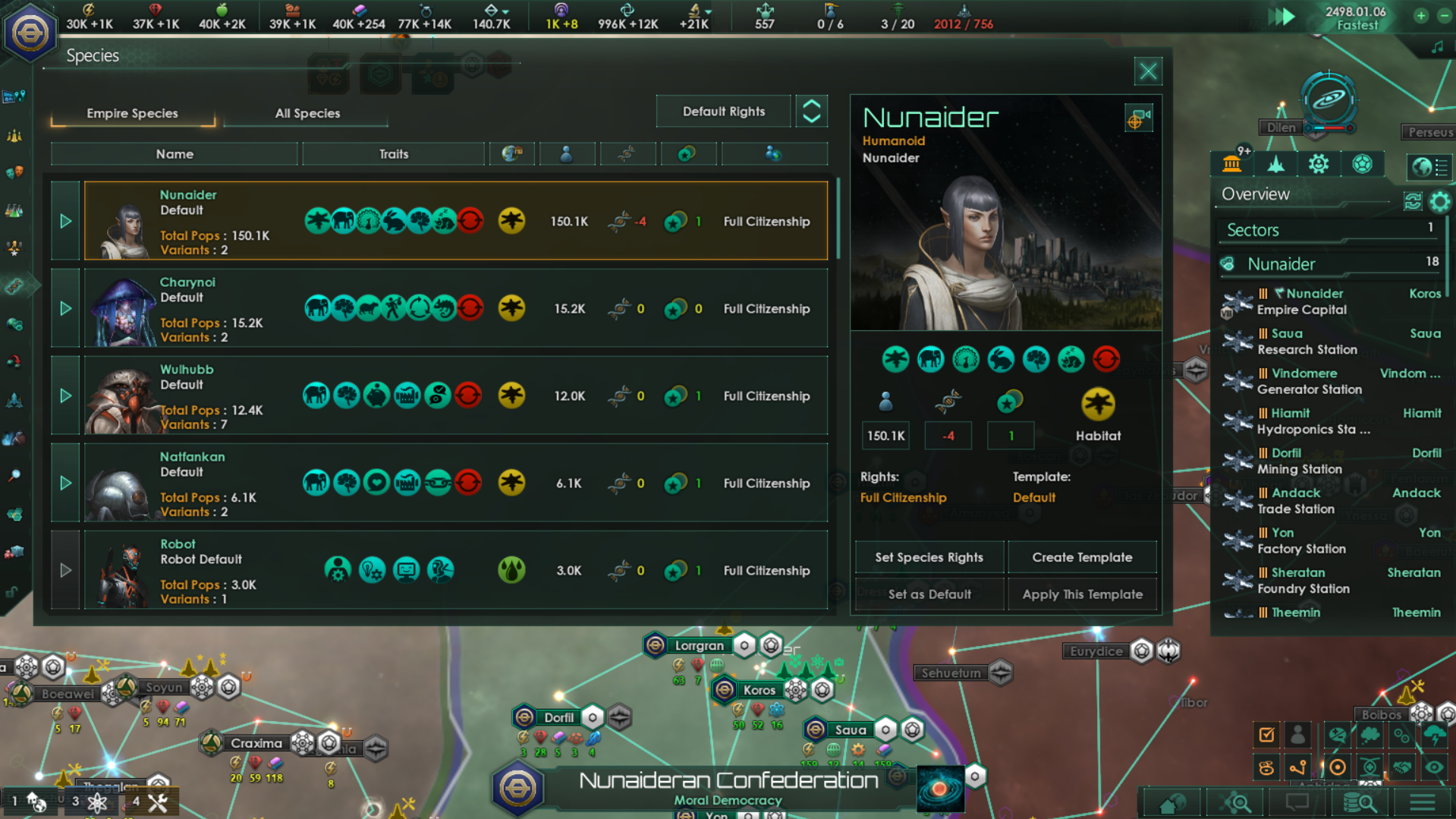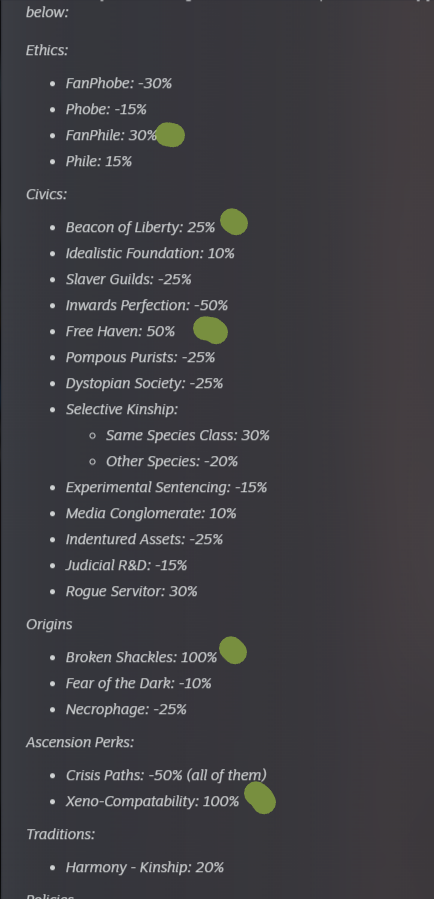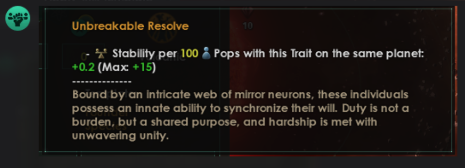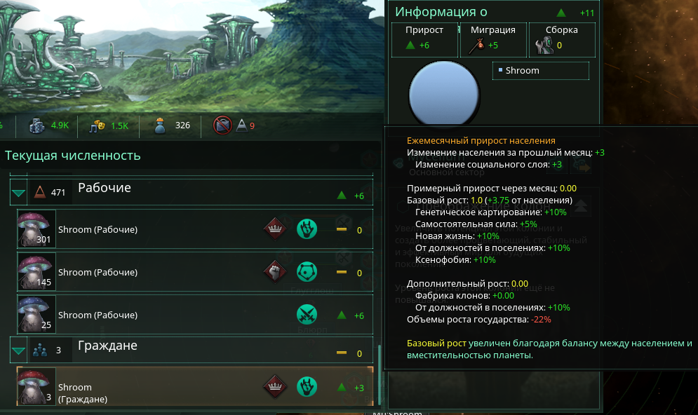 Если играете с роботами, обязательно убирайте снижение роста попов от общего кол-ва в империи. Но даже без него любой бонус, даже на -0.00000000005%, срежет прирост ровно на 1.