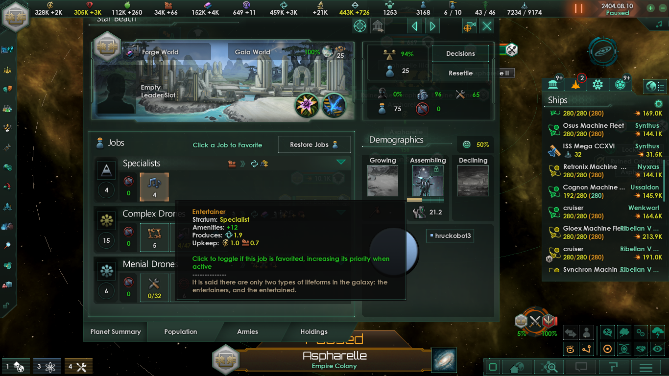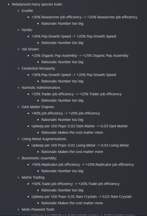 >>1298521 >>1298541 Теперь планетки и попы предположительно не лагают сами по себе, теперь все ресурсы производит одна планета, а не 9000 попов на ней. Попы только заполняют пулы рабочих мест. Но государство с многими планетами и попами способно выставить много флотов и кораблей, а вот они уже лагают. Численность флотов уже кувалдируют, занимаемый кораблями навал капасити уже увеличили в 5 раз, так победим! Даёшь эпичные битвы линкор Варспайс с парой подсосов вс десяток эсминцев!