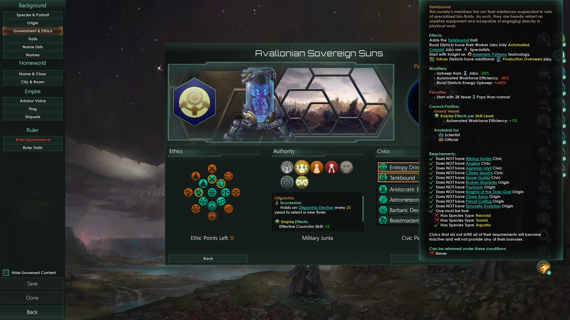Опрессивная автократия: начало. По лору, плебеям засунут сапог так глубоко, что они даже аменити не потребляют и театры и клиники им не положены. На деле: всё штабильно, всё всем (элитным ментам) норм. Бугурт возможен только на свежезавоёванных густонаселенных планетах без ментовок и на новых колониях, в которых всё население (100 ментов) состоит в фракции с нулевым счастьем. Ого какой червь-пидор! Братишка Последний человек на земле сбросил инварда, ура! Забей на пограничные тёрки, давай педерироваться в вустрогл, я тоже фанавторитарий!