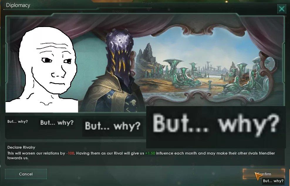 >>1291880 >где надо считать ресурсы половину игры >надо Вики читать Я дико извиняюсь, ты разве не так же в Стелларис играешь? Ну хотя бы первое время + Услышал тебя, родной