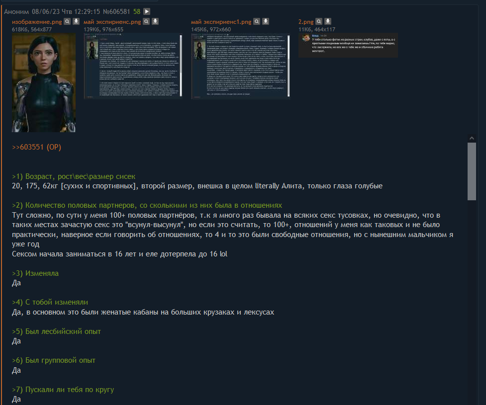 1.31, 157/44, 1, 38 2.18 3. 17 4. Ровесник 5. 4 в отношениях. Никогда не гналась за количеством, но 17 насчитала. 6. Нет 7. Да. Это был кун, который был в процессе развода и живущий отдельно от жены. 8. Нет 9. Нет 10. Нет 11. Можно сказать да. Это был кун из соседнего номера на море. После отдыха я его больше не видела. 12. Никогда не была в клубе или на вписке. 13. Примерно день. 14.Нет. 15. Нет 16. Мне 25, ему 23, мне 21, ему 26. 17. Нет 18. Много раз пьяной. 19. На несколько лет старше, 15-16 см. 20. Люблю грубоватый секс, оральный секс. В порно БДСМ и ГС, но в последнее время могу посмотреть и простое порно. 21. Вибраторы, пробки, член, наручники, кляп, плётки, веревки. 22. Нет 23. Иногда, но лёгкий. 24. Редко 25. Нет 26. В машине, в лесу. 27. Нет 28. Нет 29. Нет 30. Надеюсь не спросит) 31. Отчасти, но сейчас моя интимная жизнь менее насыщенная. 32. Нет/нет 33. Презервативы 34. Нет 35. Нет 36. Нет 37. Подруга знает, что у меня был секс без обязательств, но без подробностей. 38. Следует из п.11. Так получилось, что я поехала отдыхать на море с подругой, а после приезда она сразу же попала в больницу. И так я осталась одна. Сразу же начала общаться с куном из соседнего номера, который тоже отдыхал один. На следующий день после знакомства мы немного напились и занялись сексом. Кун оказался довольно настойчивым в сексуальном плане. На следующий день он купил пачку из 12 презервативов, что меня сильно удивило, но в итоге мы ее полностью потратили. Мы занимались сексом по 2-3 раза в день, достаточно бурно и жёстко. В какой-то период у меня было 2 партера. Получилось так, что одному из них обещала встретиться и забыла, что собиралась идти ночевать к другому куну. Я встретилась с первым куном и под выдуманным предлогом ушла от него ко второму. По итогу у меня был секс с обоими в один день. На следующий день у меня был секс снова со вторым куном, а вечером я наоборот пошла ночевать к первому куну. 39. Попробовать ГС, но вряд ли смогу себя перебороть.