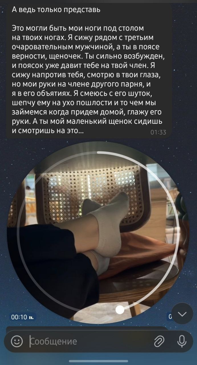 Я могу сделать легкую вводную по нашим отношения сейчас: Я буквально отдал все ключи от пояса верности и хожу в нем. До какого момента? А я уже и не знаю. Моя Госпожа владеет ключами и я не волен уже ими распоряжаться: Месяц,пол года, год, вечность — это уже ей решать. Звучит буквально, как из "дрочных" рассказов, но это действительно так. Хочу ли я, чтобы мой член был заперт так, чтобы параметры выхода определяла именно Хозяйка? Да, я желаю. Так и происходит. Почему я решил вообще высрать свою "пасту"? Да я, если честно ,сегодня ахулел от требований своей Госпожи: "Если ты хочешь выйти — плати деньги. Я люблю тебя, но держать тебя возле себя я не намерена. Хочешь свободы — плати! Хочешь после освобождения войти в мою пизду — плати! Хочешь близости — плати.Хочешь скидок — лижи мои грязные пятки и не выебывайся. Ты будешь лизать и сосать все то, что я захочу, ибо такой пидор как ты, должен боготворить, обожать и любить все, что касается твоего ебучего рта! Хочешь, чтобы я тебя не развелась с тобой — оставайся послушным, иначе я тебя брошу!