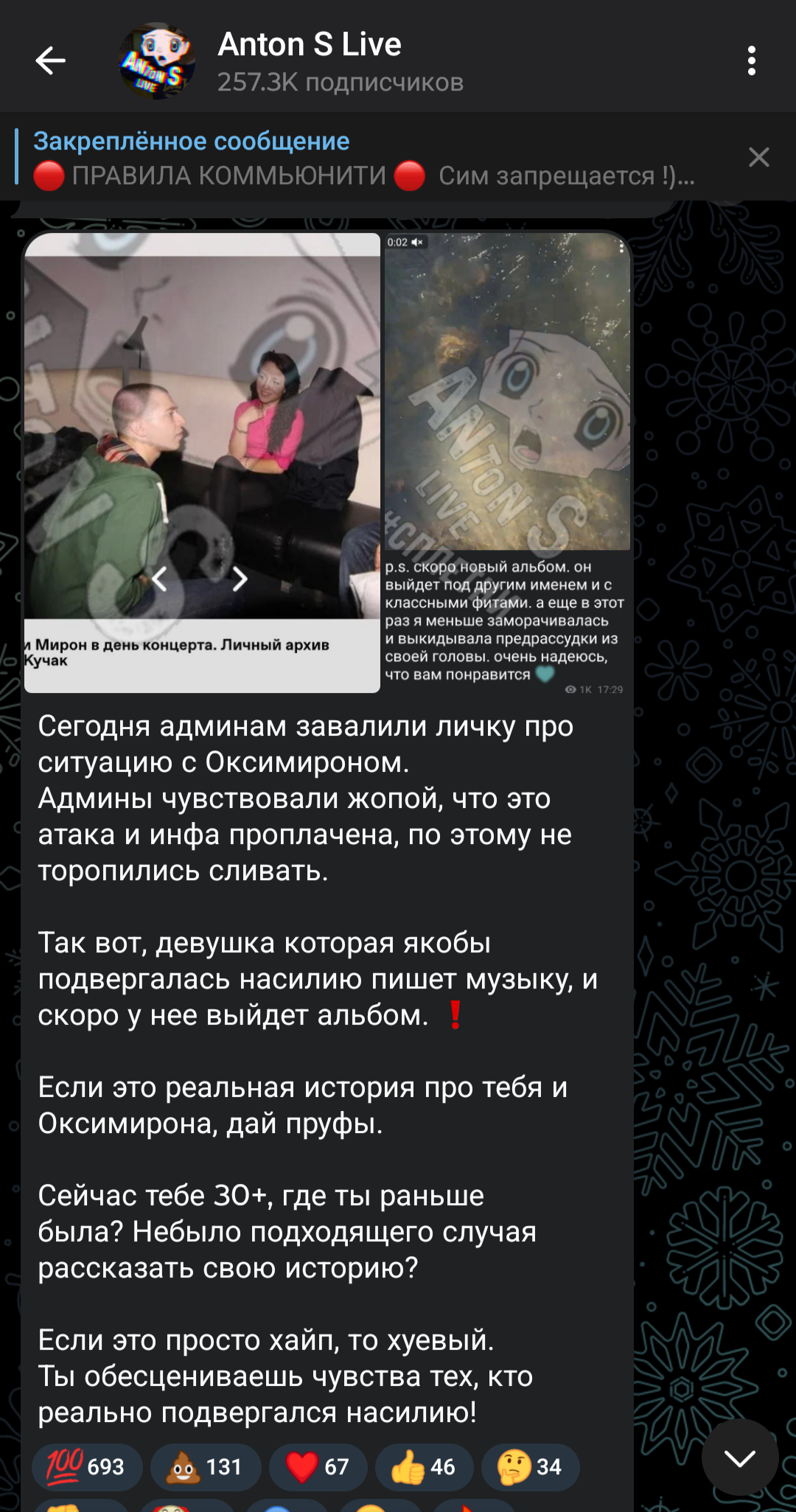 >>998862 Да оба, похоже, педофилы или какое там модное слово для этого придумали. Мне не особо импонируют автор_ки подкаста, их подача материала и вся эта публика вокруг, многие прямо не нравятся, но нормализовывать то, что дядька в 23 года написывает 13-летке, зазывает в аську, чтобы вздрочнуть, это бред. Как и аргументы типа того, что скрины легко подделать, как будто лёгкость подделывания автоматически доказывает, что скрины не могут быть подлинными. Это ведь так реалистично, типа его оболгали фальшивыми скринами (или теми, что типа админка сама себе наотправляла), а он и его представители молчат и обтекают, ну да. Да им просто нечего ответить, так как скрины не подделка. Не случайно на первых порах он пытался заплатить за молчание. То, что суровый атата грайм рэпер себе админами группы назначал каких-то детей, это отдельный кек. С головой у Мирона явно какие-то проблемы. Нет желания ему желать, чтоб гнил в тюрьме, но и симпатии нет также. Ему бы к психиатру, а то он где-то сообщал вроде, что лондонские врачи назначили ему психотропы, которые он никогда не пил. Вот может зря, может, они чего знали, что этому человеку таблетки необходимы.