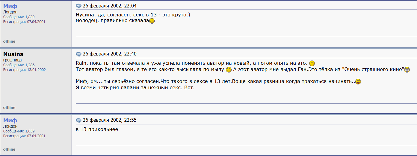 Тот же мужик в 26 лет начинает с ней встречаться, параллельно пишет 13-летней школьнице из казахстанского посёлка. Будучи в отношениях, 3 года ведёт переписки с несовершеннолетней и не достигшей возраста сексуального согласия школьницей. В 16 лет на концерте точно-точно уточняет, что ей 16, и насилует. После этого кидает в чс.