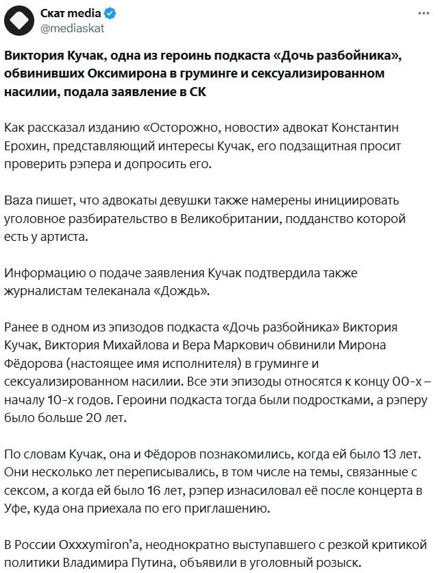 Не опять, а снова. Будет весело, если щас ещё всплывёт куча девушек, которых окси ебал в малолетстве. Вот умора будет, представляю какой цирк закатят шок и царь в своих тг каналах. Не хватает только пива и чипсов. P.s. Интересно, а что это щас девчата решили рассказать об этом? Особого повода же не было