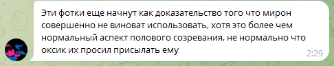 А если без стеба, то Мирону как-то непропорционально жестко прилетело. По сути накопали только 3 кейса и из них только одной не было 16, а секса с малолеткой не было ни одного (переписки стыд, конечно). А кармы сейчас огребет как за целый класс лолек.