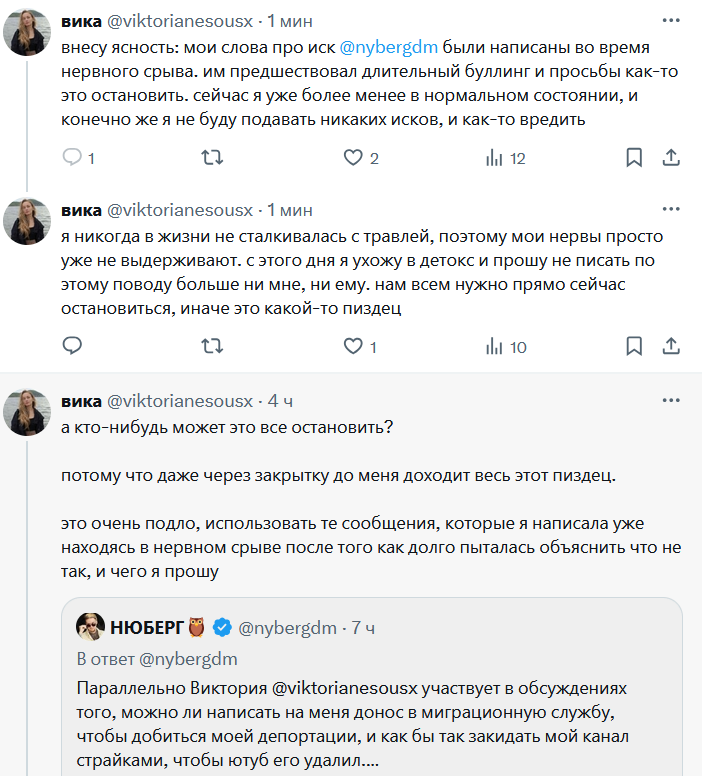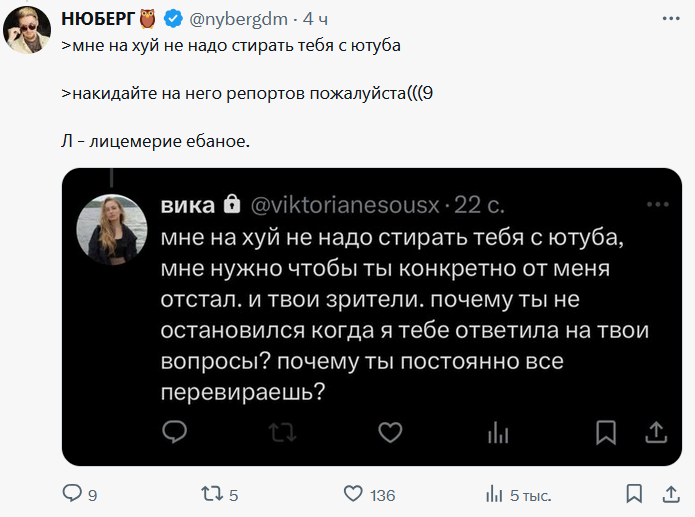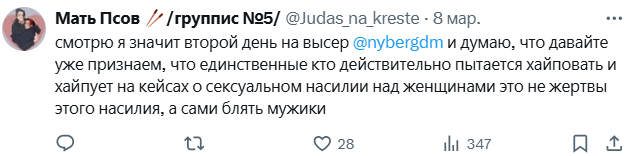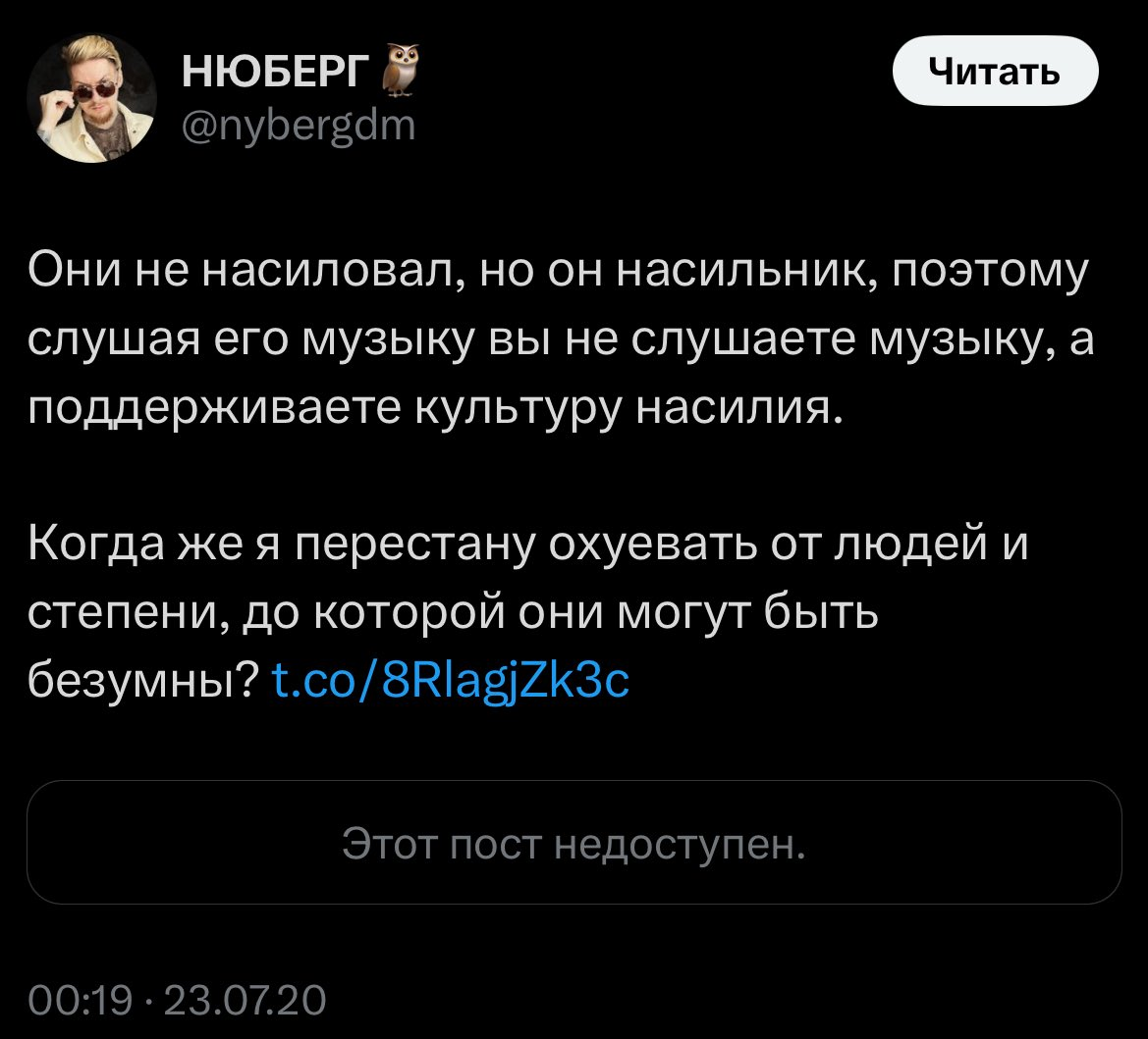 Написывала она в 13 лет оксимирону сама, он безусловно виноват, если в том возрасте ей что-то пошлое писал и нюдсы запрашивал и его надо судить именно за это, за растление, а не за изнасилование. Вот только если бы на месте него был ноунейм такого же возраста, который не выпустил потом "кто ебал марка", считали бы они себя жертвами, подавали бы в суд и ск, встречались бы с ним потом еще? ебались бы через 8 лет снова? просили бы 200к на психолога? ЧЕРТ ВОЗЬМИ, НЕТ. Значит дело в банальной обиде, зависти, фрустрации от того, что ему охуенно, что он поплакался на миллионную аудиторию, а они не могут. Это натура такая, ятаких людей знаю и они не меняются с подросткового возраста, вы наверняка сами таких знаете, это обиженки по жизни, никогда на себя ответственность за свои проебы они не возьмут