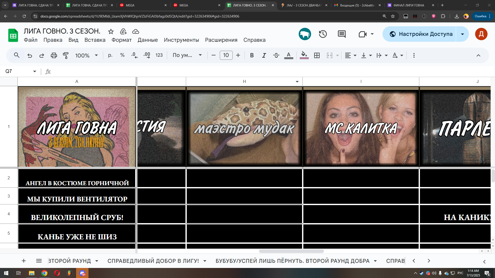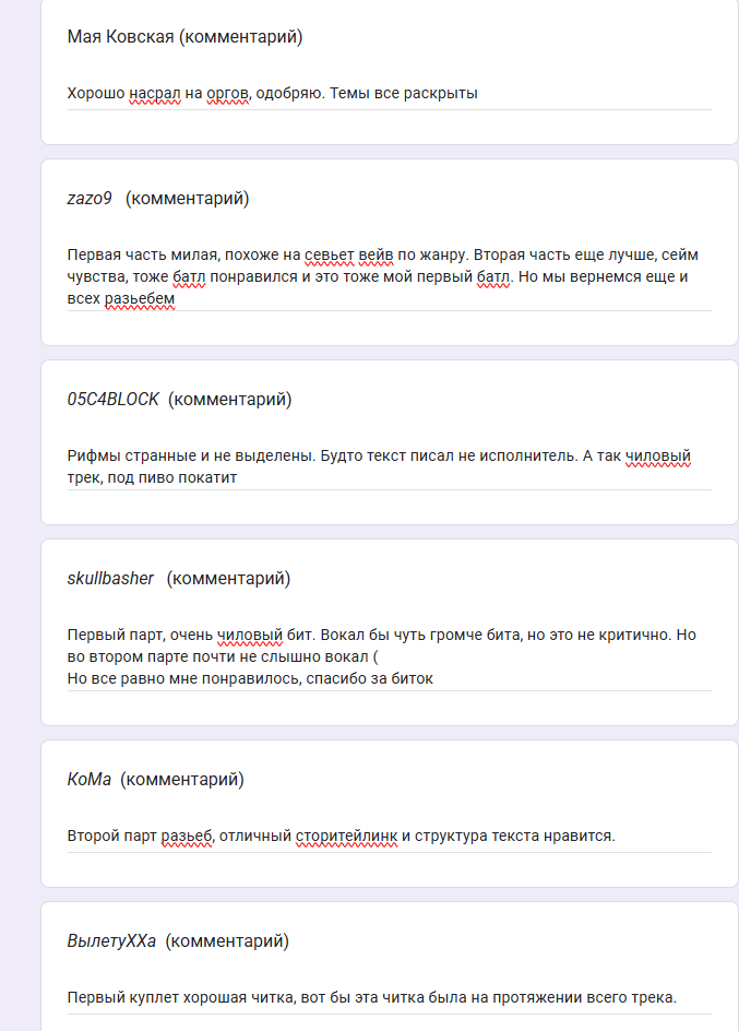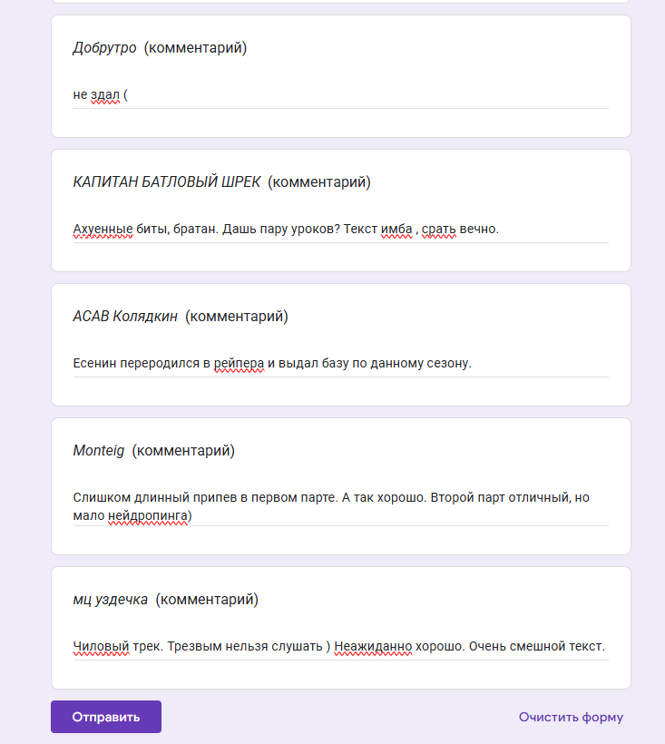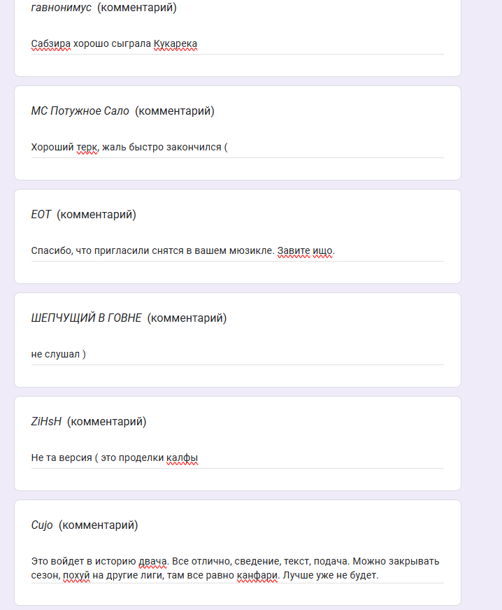 Доброй ночи, дорогие! Форма для судействм лиги говна отправлена! Всё по классике - к каждому треку можно оставить комментарий, выбираем только ТРОЙКУ лучших. Кто ещё хочет добавить себе аватарку в таблицу - отправляйте на почту, треки и текста все в меге. На всякий можете перепроверить правильная ли версия залита если пересдавали в форму. ДОБРУТРО, ШЕПЧУЩИЙ И ГАВНОМИНУС, РОДНЕНЬКИЕ, ЗА ЧТО ВЫ ТАК С НАМИ? Всем благодарность за сезон, очень много годного и интересного контента, все умницы! На днях придёт форма по реквесту зазо9с лучшими флоу/панчами/вайбом и тд, необязательная, по желанию, будет в табличке в отдельной вкладке.