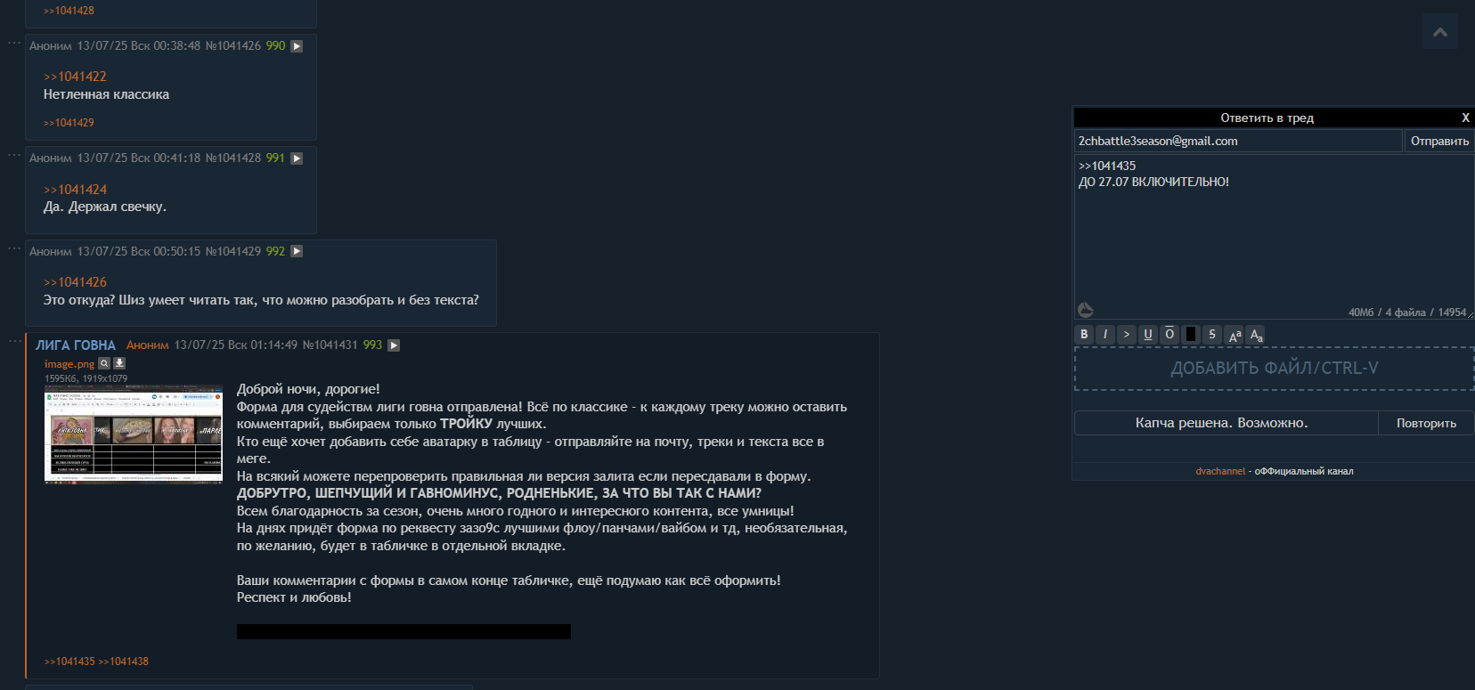 доброй ночи малютки! продлеваем сбор треков до субботы включительно, кому не пришла форма тегните на почту - 2chbattle3season@gmail.com все кто хотел заценить на стриме всех великих поэтов - искренне прошу не отчаиваться и дождаться всех красавцев в ночь между сб вс разошлю форму судейства - уже готова!!