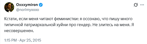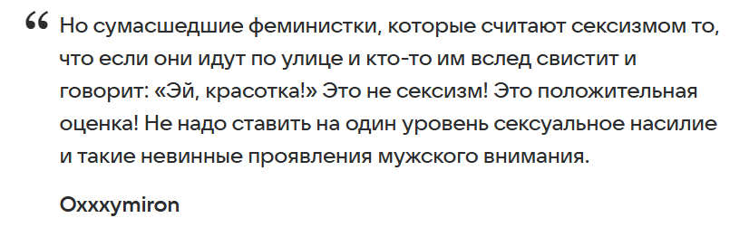 >>1045701 → Да не было у него никакой направленности. С одной стороны пишет "прастити за сексизм девачки я всьо панимаю долой патриархат", и тут же через два года пишет "фемки совсем охуели им уже кскс от обрыганов на улице не нравится вообще зажрались тёлки ета вообщето комплимент!!"